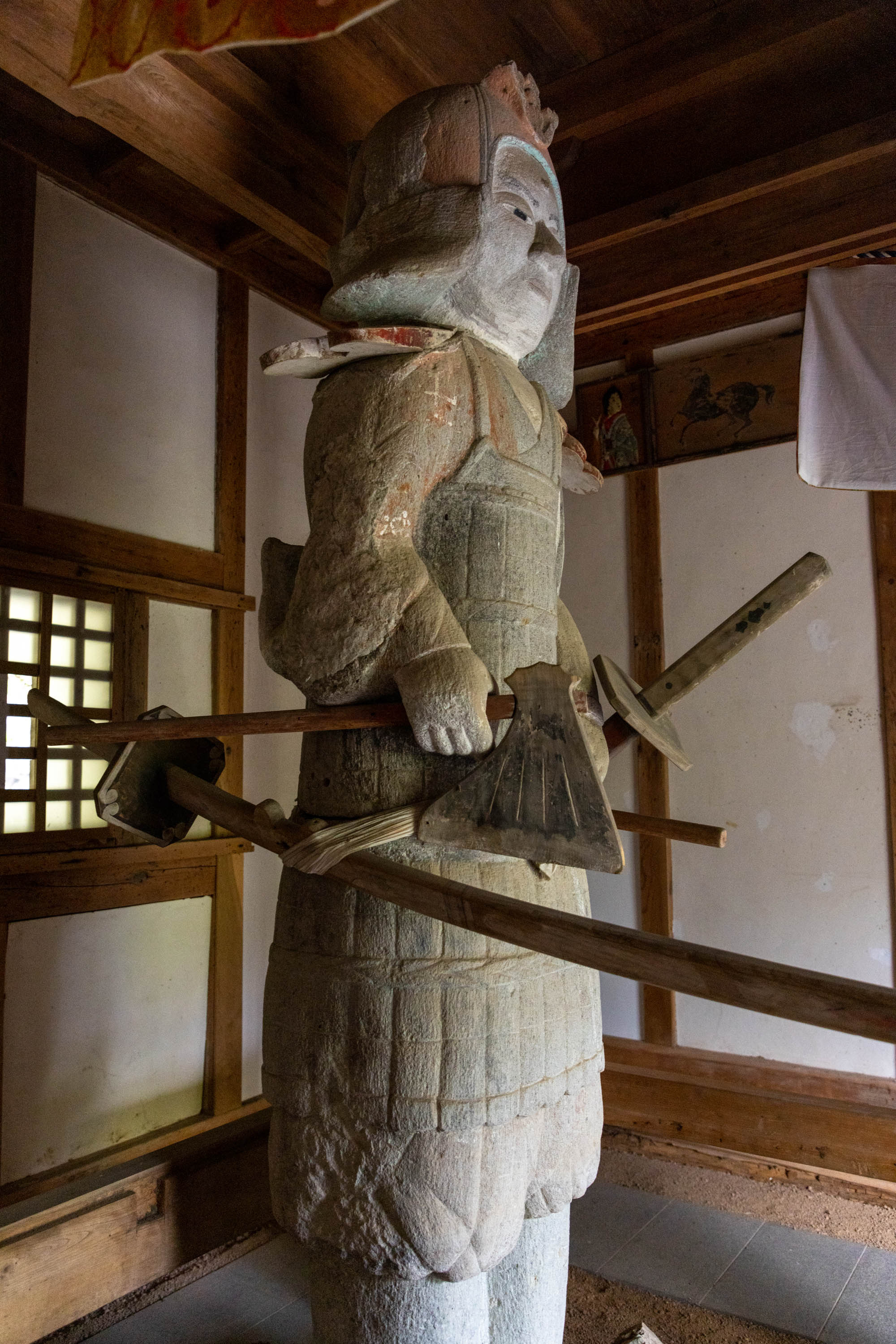 千光寺では開祖として両面宿儺4体を祀っており、寺内にある宿儺堂には石像の両面宿儺が安置されています。宿儺堂は慶長3年(1598年)再建と伝わることから、これより前から千光寺で宿儺信仰が行われていたことは間違いないようです。宿儺堂は限定的に公開されており、非公開時も前後の小窓から宿儺のそれぞれの顔を拝むことができます。正面、背面ともに柔和な顔つきで、悪鬼のように描かれている日本書紀から受ける印象と異なります。剣や鉞のような武具を正面、背面それぞれに携えているのが造形的な興味をそそられます。