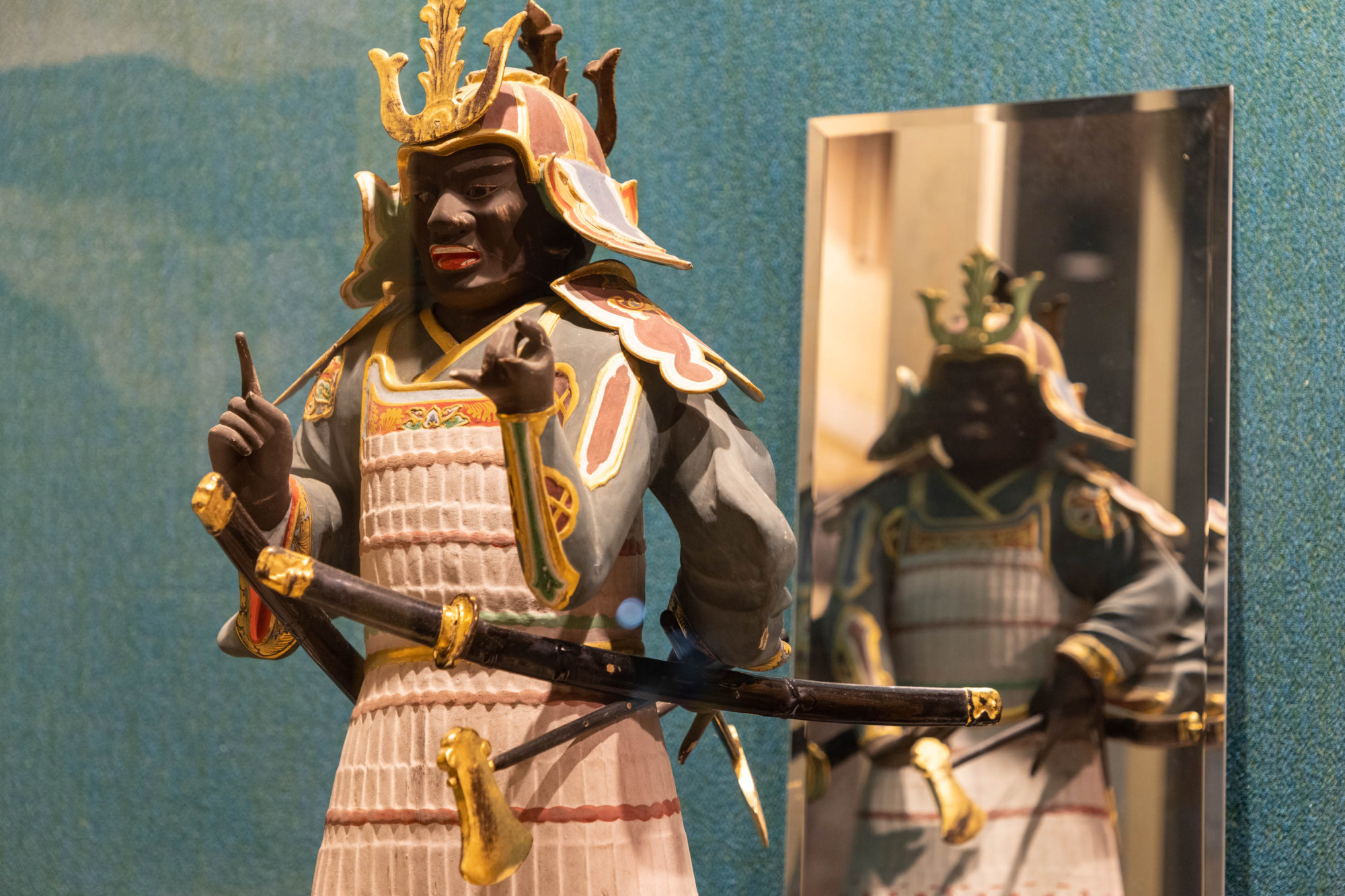 善久寺に残る両面宿儺像は製作年代や作者は不明ながら、中国風の衣装を身にまとった端正な顔つきの立像です。慈愛に満ちた柔和な面と憤怒の面を前後に併せ持ち、4本の腕に2丁の斧を携えています。顔面は金、甲冑は黒ずんだ中に朱塗りが多く残っており、元は鮮やかな彩色が施されていたものと想像できます。