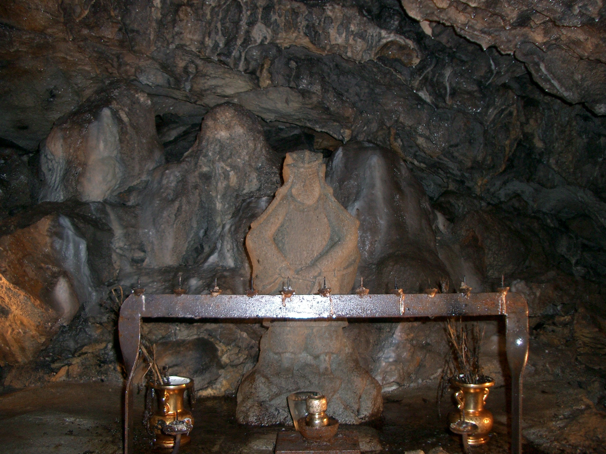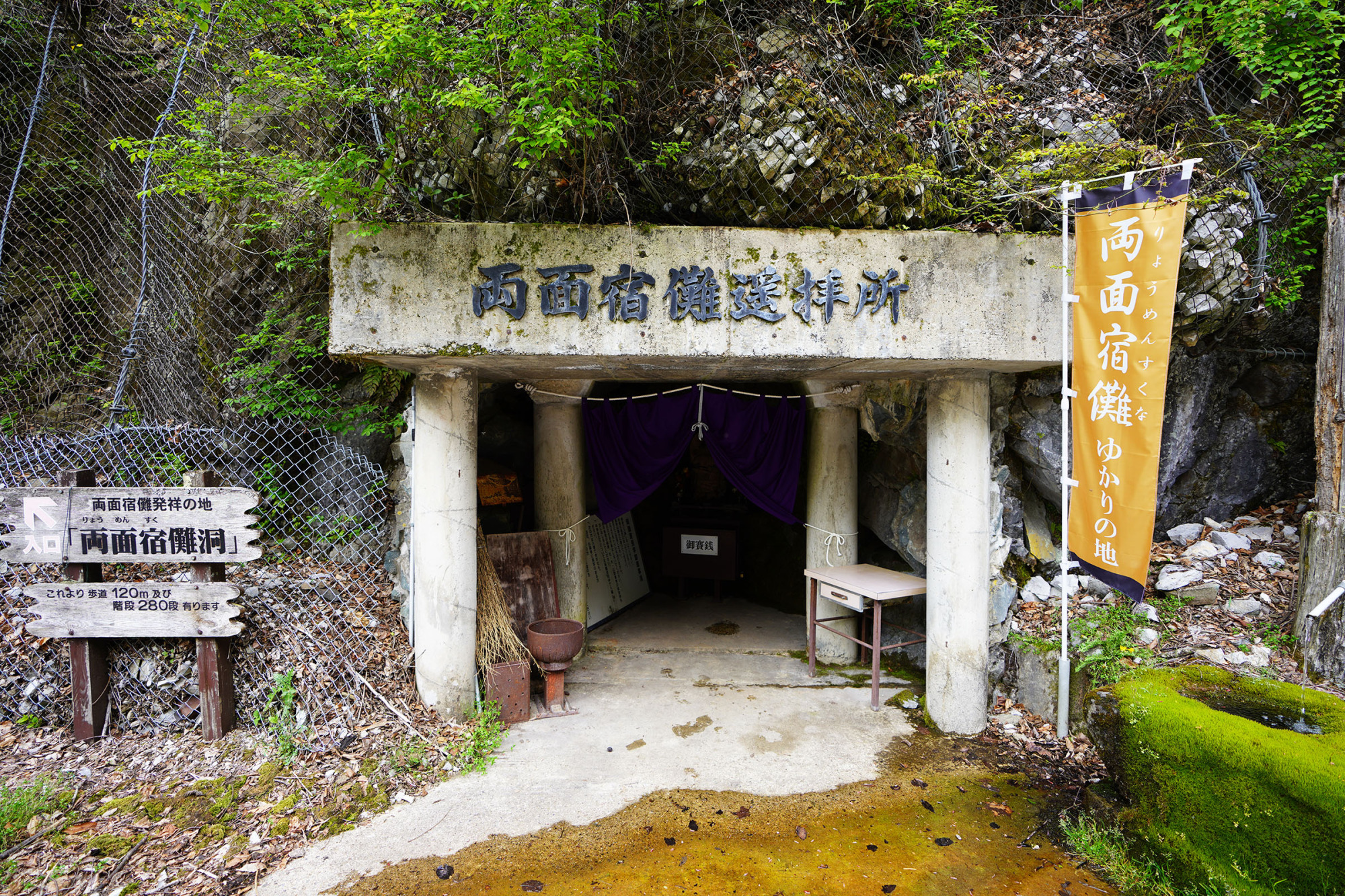 この飛騨大鍾乳洞の向かいの山中に宿儺が出現したとされる両面窟があります。鍾乳洞の西方約100m、人の往来を強く拒むような急峻絶壁にあり、両面宿儺が住んでいたという伝説と、訪れる者があれば天候が荒れるとの言い伝えがあり、江戸時代の地誌「飛州記」にその記述が残ります。洞窟の奥に宿儺像が安置されており、かの弘法大師が両面窟で宿儺の供養をしたとも伝えられています。