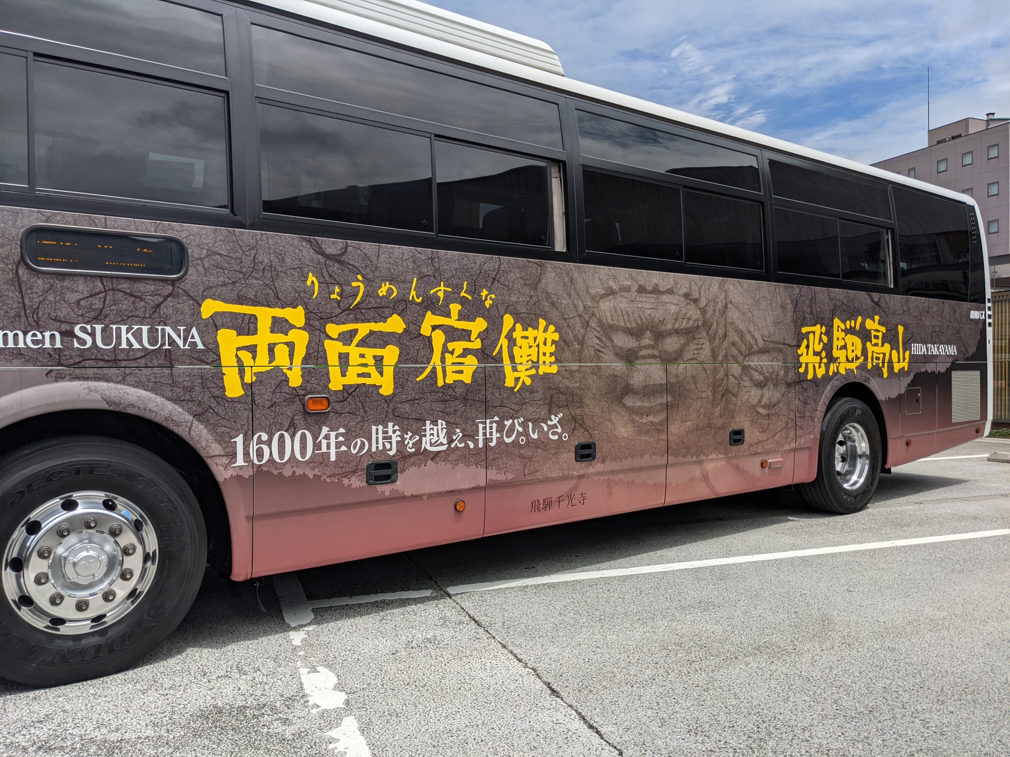 令和3年(2021年)、高山市と各地を結ぶ高速バス路線に千光寺の両面宿儺座像を配したラッピングバスが運行を開始しました。「呪いの王」と飛騨高山の関連性を知る人は多くなく、たくさんの人に両面宿儺発祥の地である飛騨高山を知っていただきたいという思いよりスタート。新宿線、大阪線、名古屋線、岐阜線のいずれかを運行しています。レアな2台のバスに遭遇できた方はかなりラッキーかも!