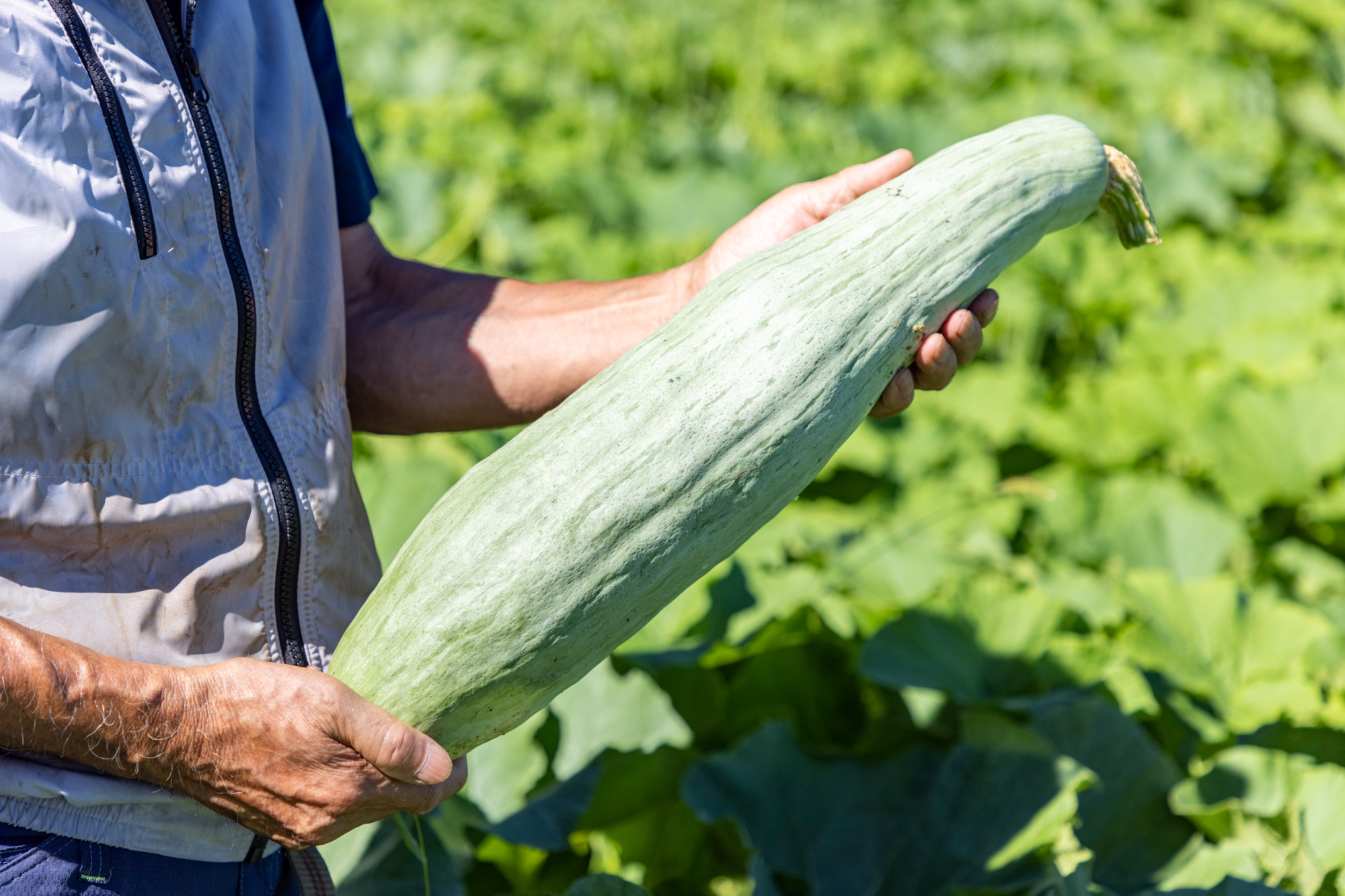 へちまのようにひょろっとした形が特徴的な宿儺かぼちゃ。平成12年(2000年)に丹生川町の新たな特産品を、と研究が始まり、今では丹生川町のみならず飛騨高山の特産品として広くその名を知られるようになりました。