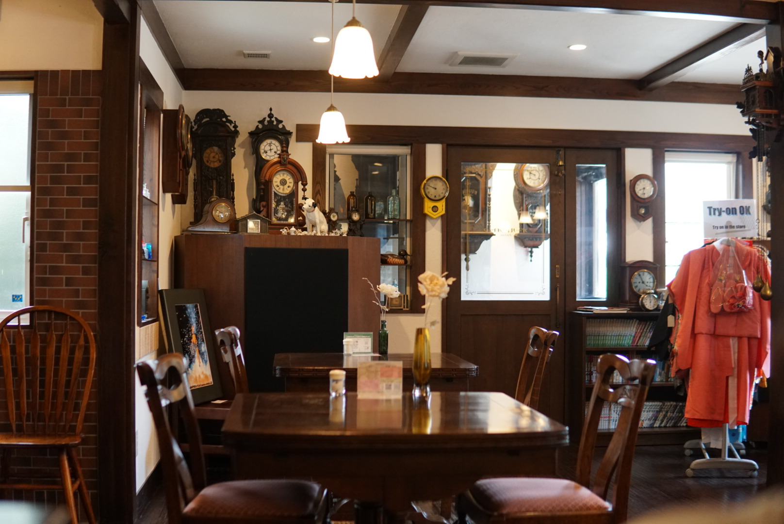 店内にはアンティーク時計が静かに時を刻む落ち着いた空間が広がり、レトロな雰囲気の中でゆったりとしたひとときを過ごせます。