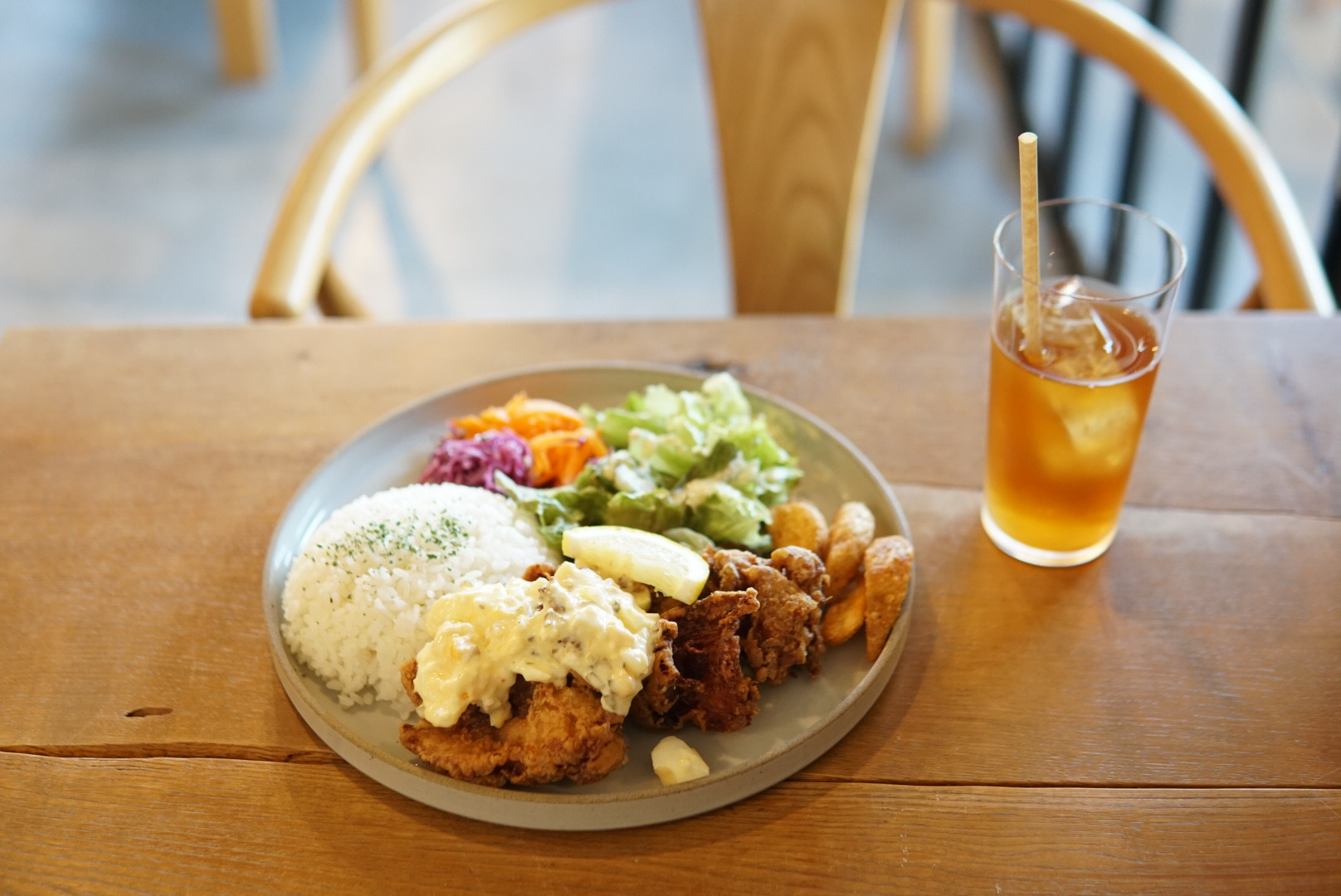 とある日のランチ、私が頼んだモチコチキンプレートはカリカリの衣をまとったジューシーなチキンがたっぷり!!サラダやキャロットラペなどしっかり野菜も摂れ、とてもおいしかったです。