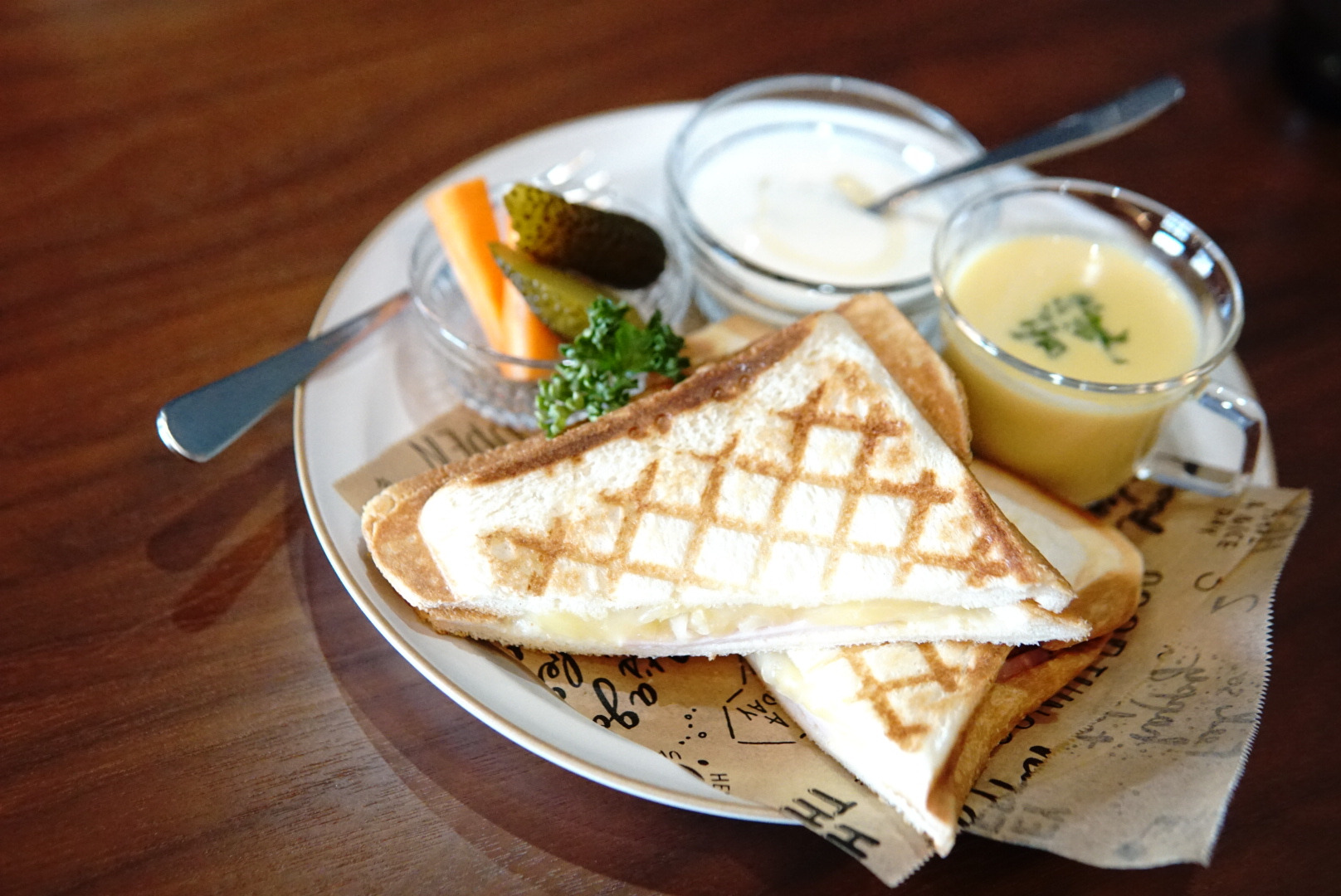 最近はメニューも増えてますます利用しやすくなったのですが、オープン当初から人気なのがホットサンド♪プレートを頼むとスープ・ヨーグルト・ピクルスが付いてきます。