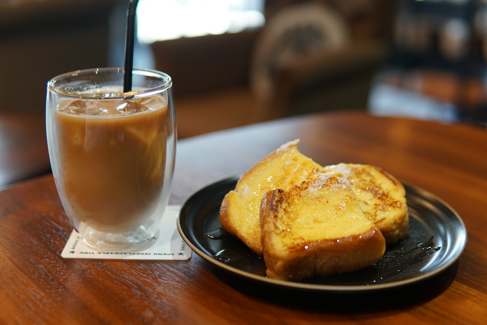 朝9時から11時まではドリンクにプラス200円でモーニングセットを楽しむことができ、地元の人気パン屋さんのトーストをたっぷりのバターで贅沢にいただきます。