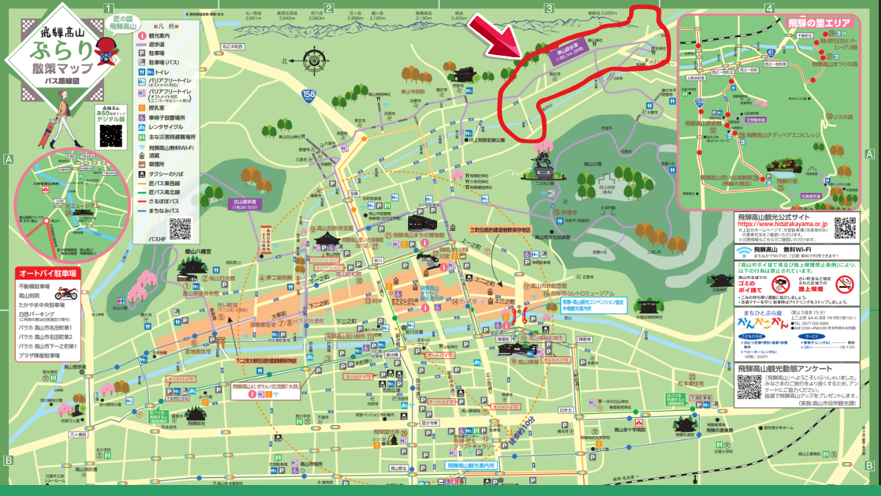 ▲「飛騨高山ぶらり散策マップ」より。地図の右上・赤丸で囲った箇所が、今回ご紹介するエリアす。