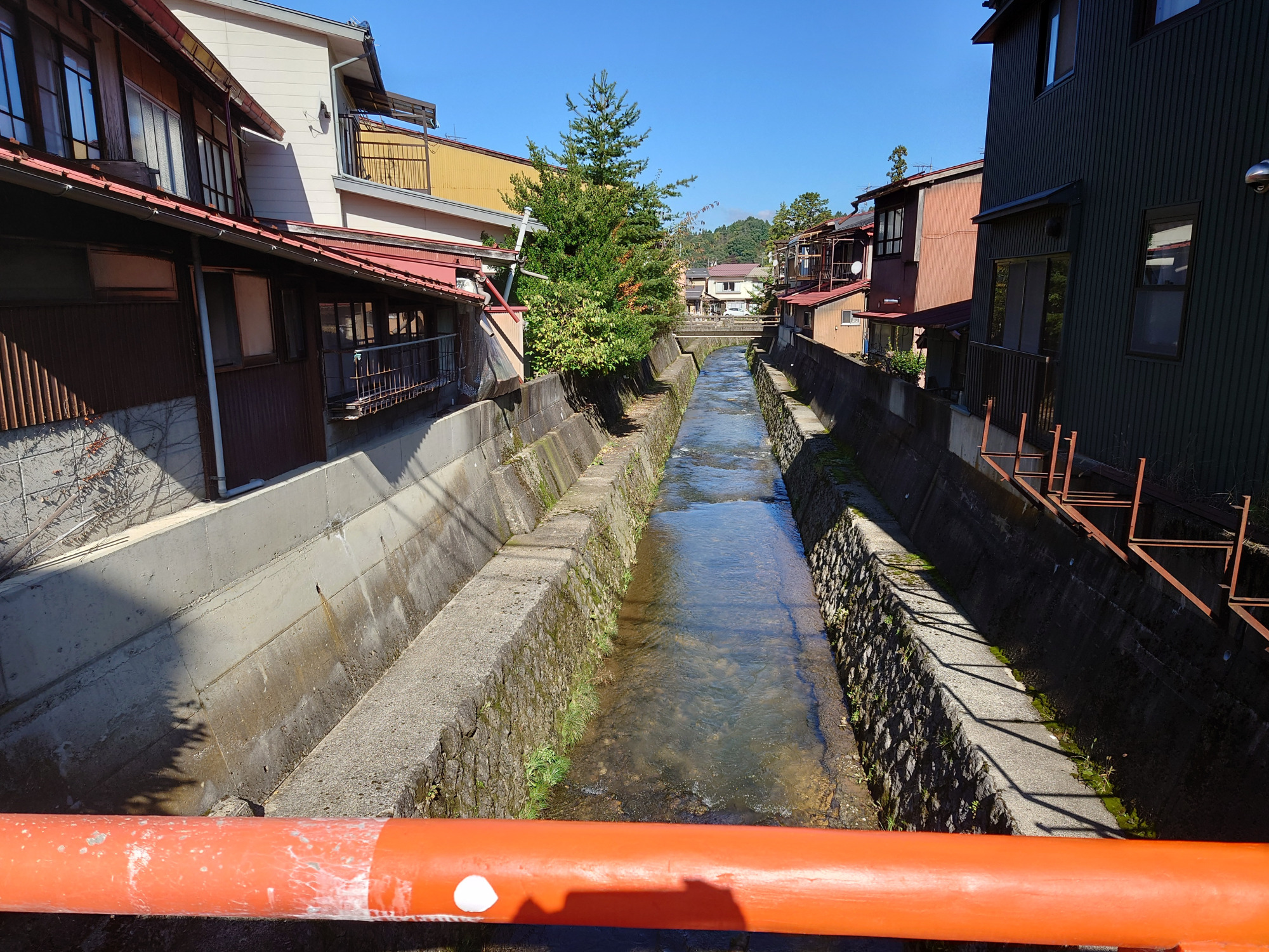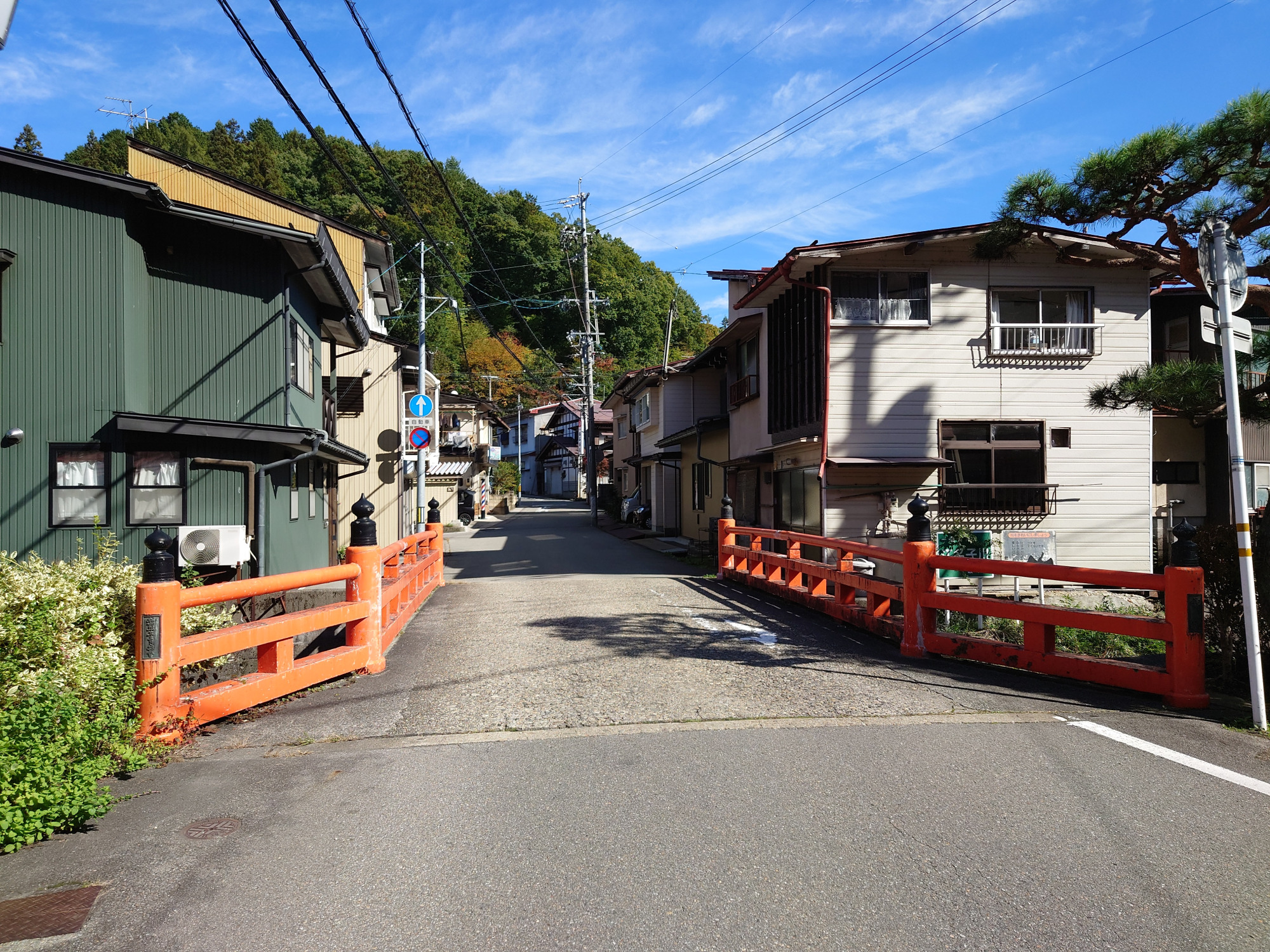 飛騨高山まちの博物館の横にある「えび坂」を登って少し進み、途中、飛騨米穀・城山営業所の角を右に曲がって、城山を右方に感じながら直進すると、左手に朱色の橋が見えてきます。「錦橋」といいます。