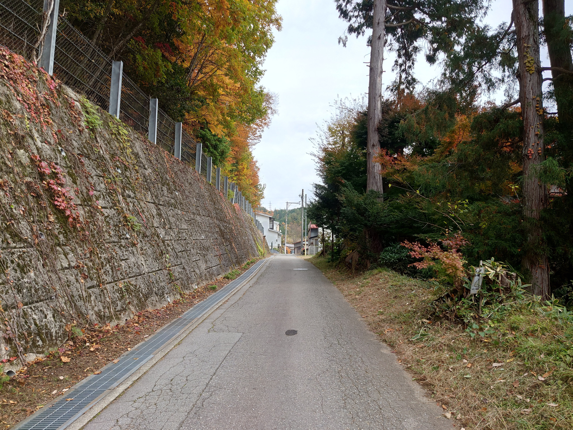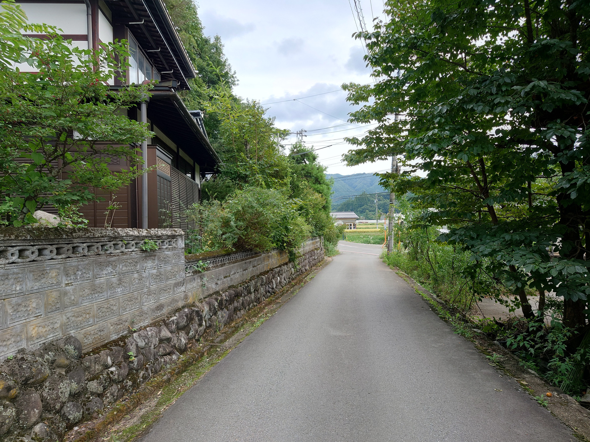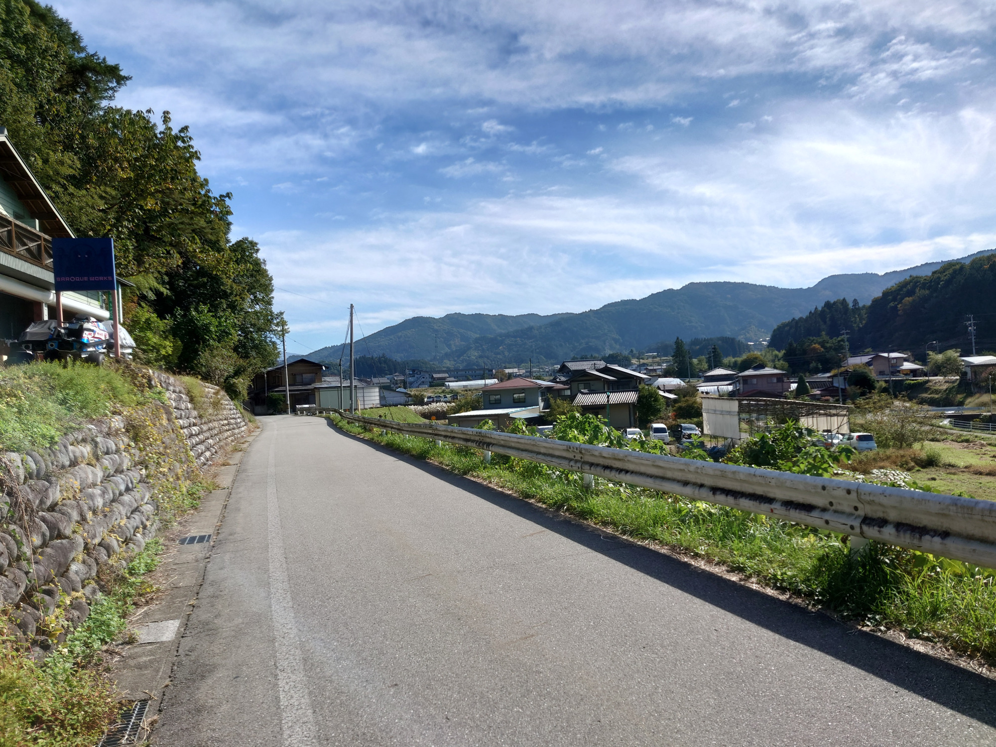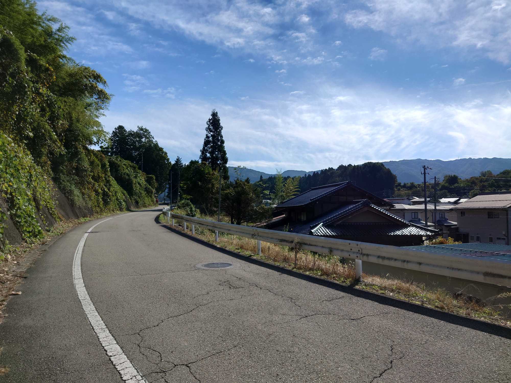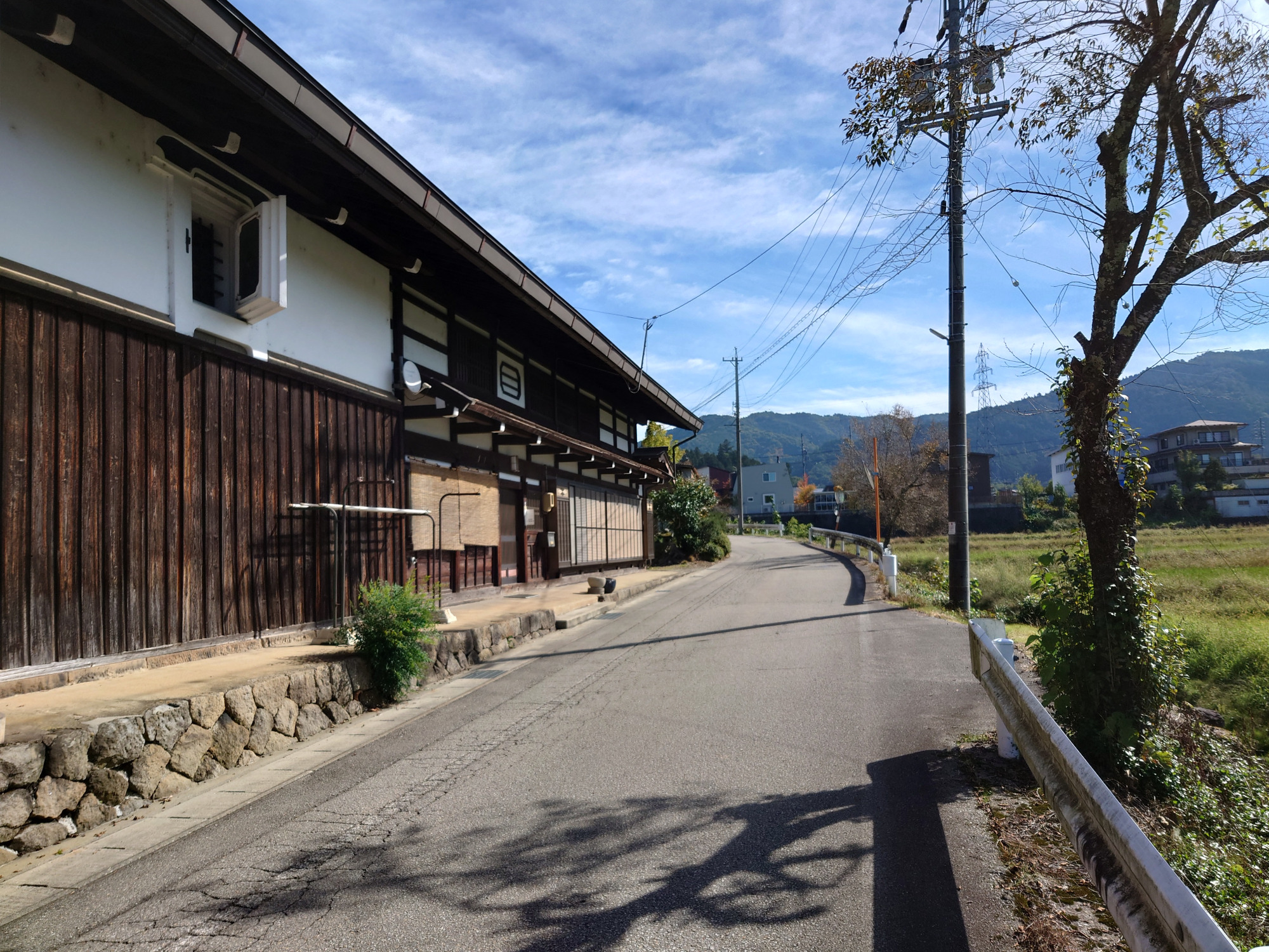 ▲小学校を通り過ぎた先で、昔の街道筋の名残を感じさせる風景に出会いました。 左手の家は、司馬遼太郎が『街道をゆく・飛騨街道』で「うつくしい」と感嘆した、伝統的な飛騨の民家の造りをしています。