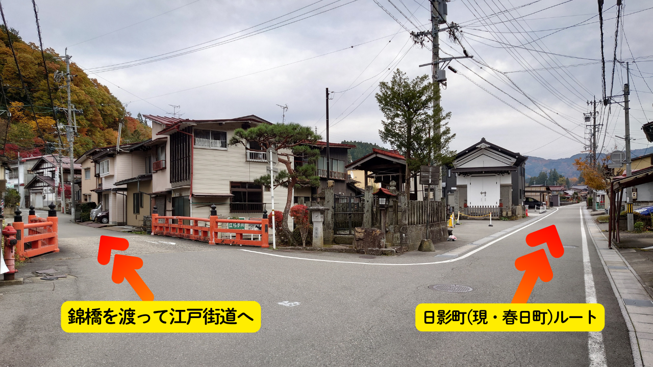 ▲錦橋。橋のこちら側は春日町(旧日影町)、橋を渡ると宗猷寺町。まっすぐ進んで右に曲がると江名子町です。