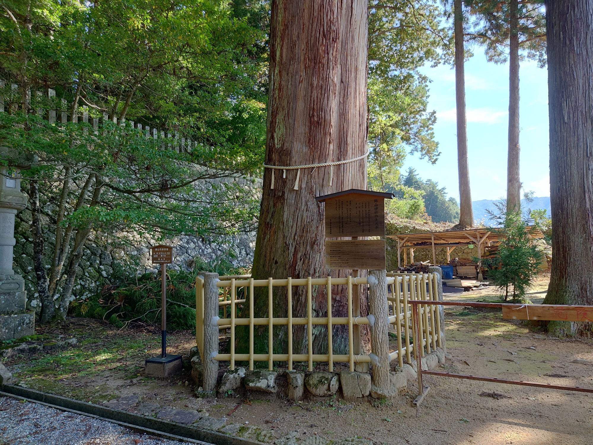 ▲境内にある大スギ。推定樹齢は400年、高山市の天然記念物に指定されています。古くから「天狗様(神様)が住む御神木」として、地域の人にが崇められてきました。