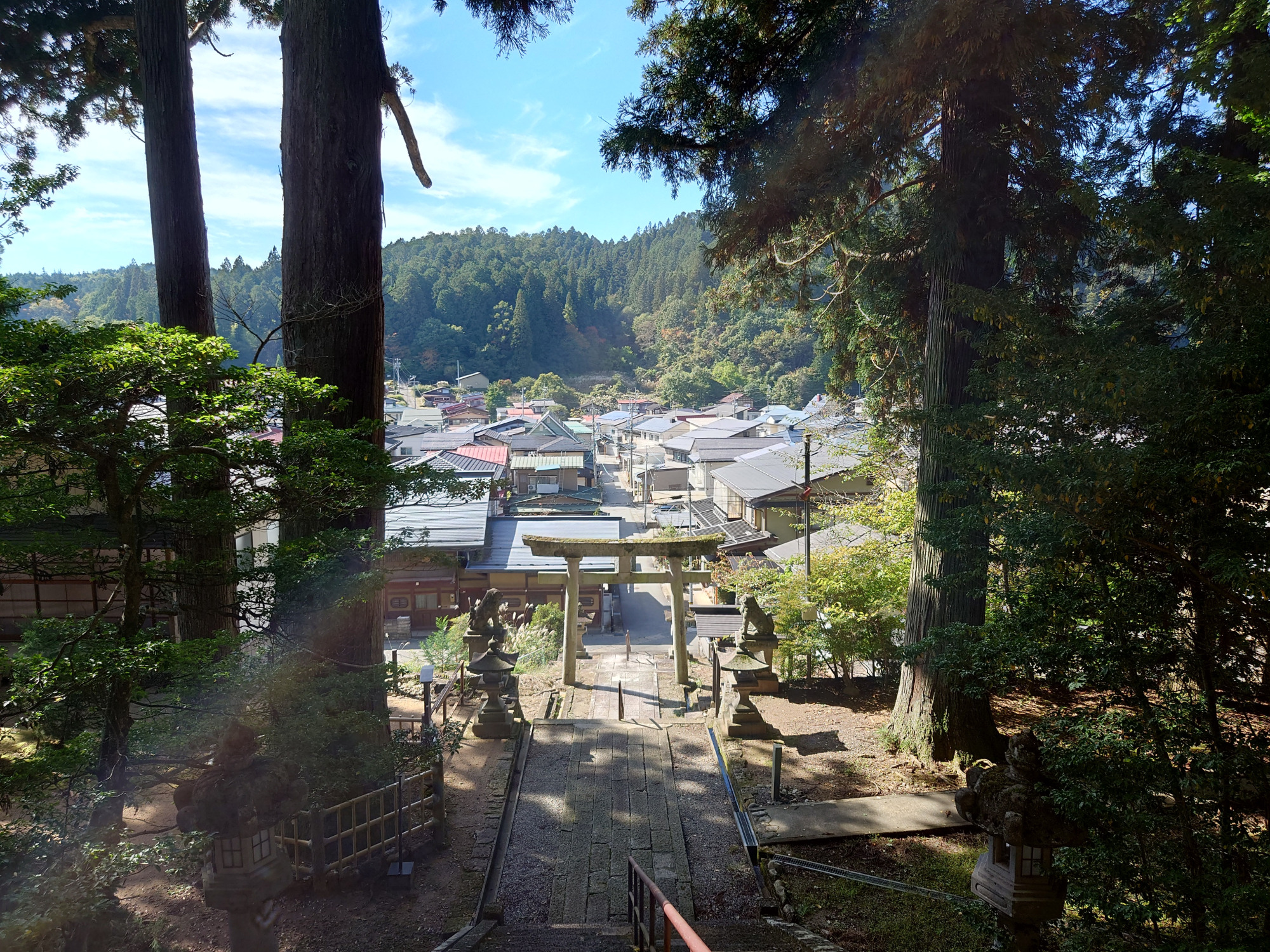 ▲拝殿前から眺める風景。正面に見える山は「城山」です。