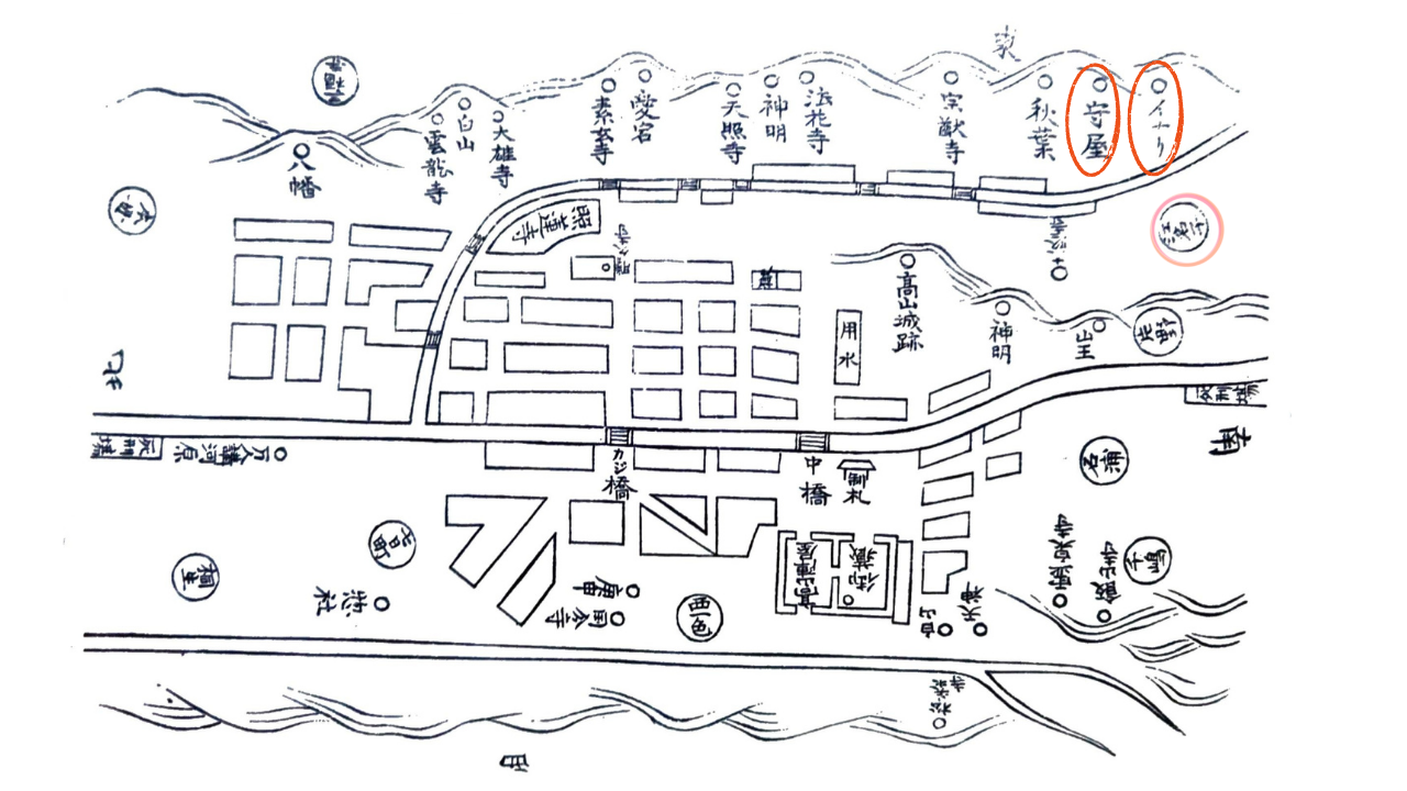 ▲江戸時代中期・天領時代の高山の様子。「守屋」と「イナリ」(稲荷)の文字が見られます。(『飛州志』より)