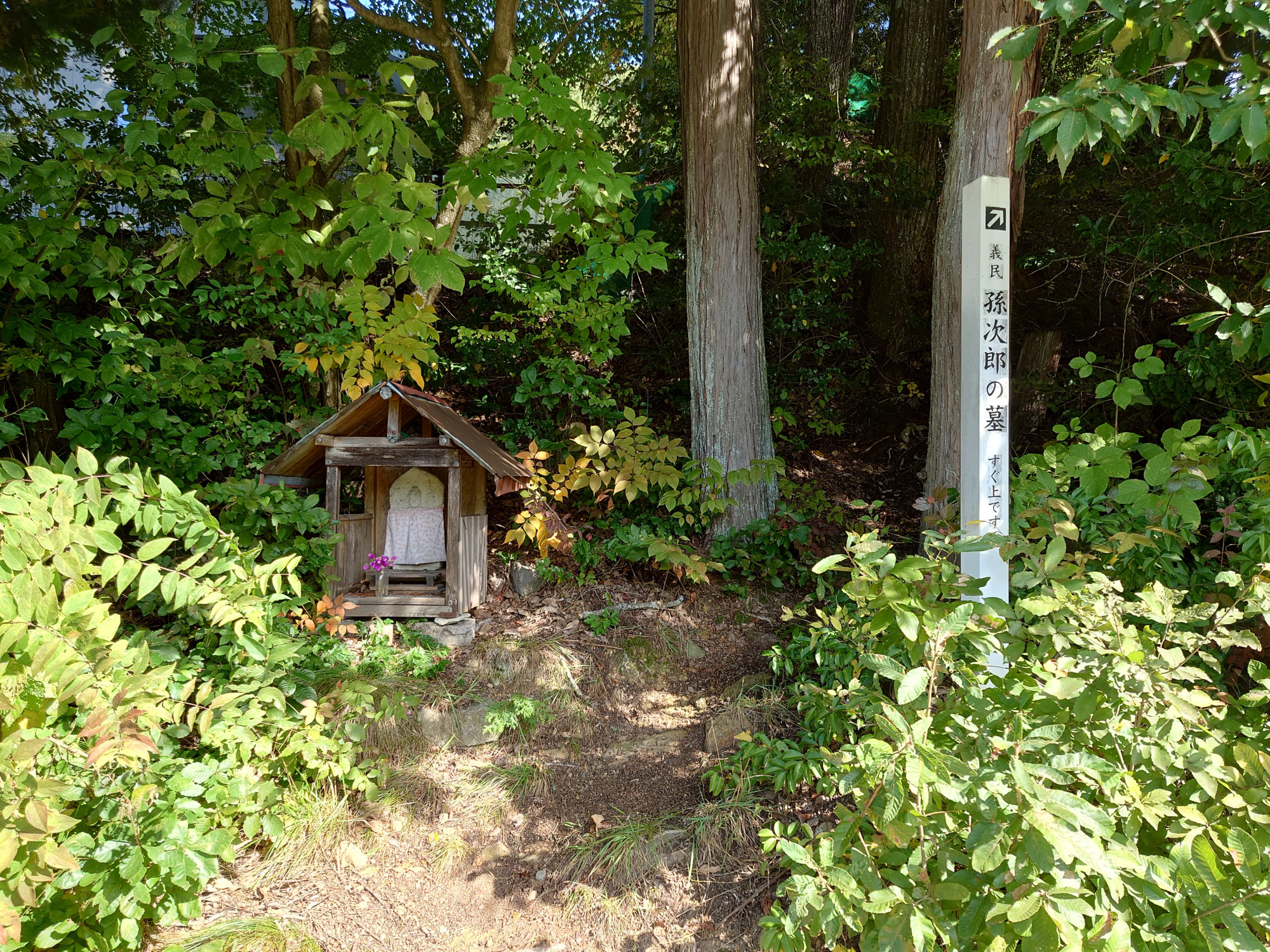 左手の斜面に、小さな祠と「義民・孫次郎の墓」と記された標柱があるのを見つけました。