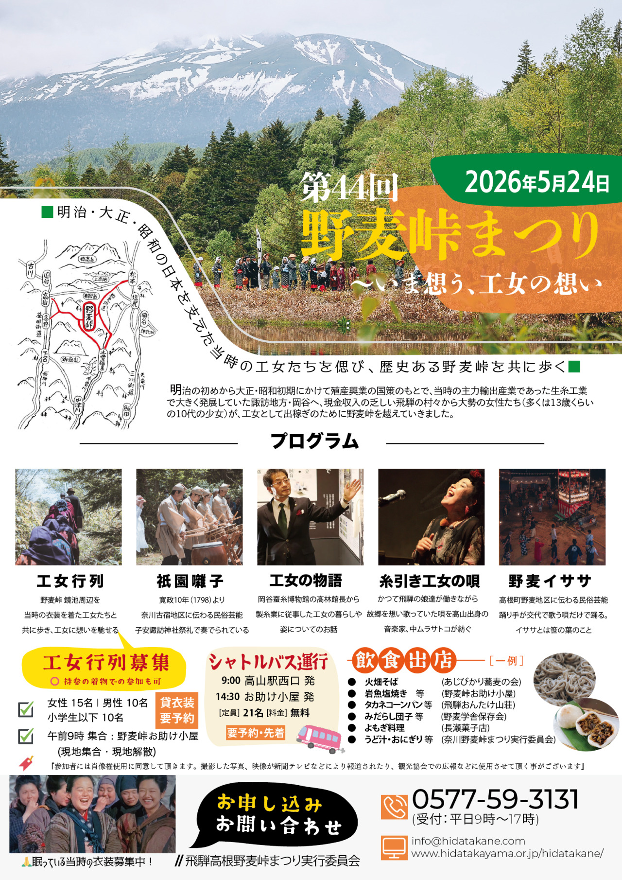 ~明治・大正・昭和の日本を支えた当時の工女たちを偲び、歴史ある旧野麦街道を共に歩く~