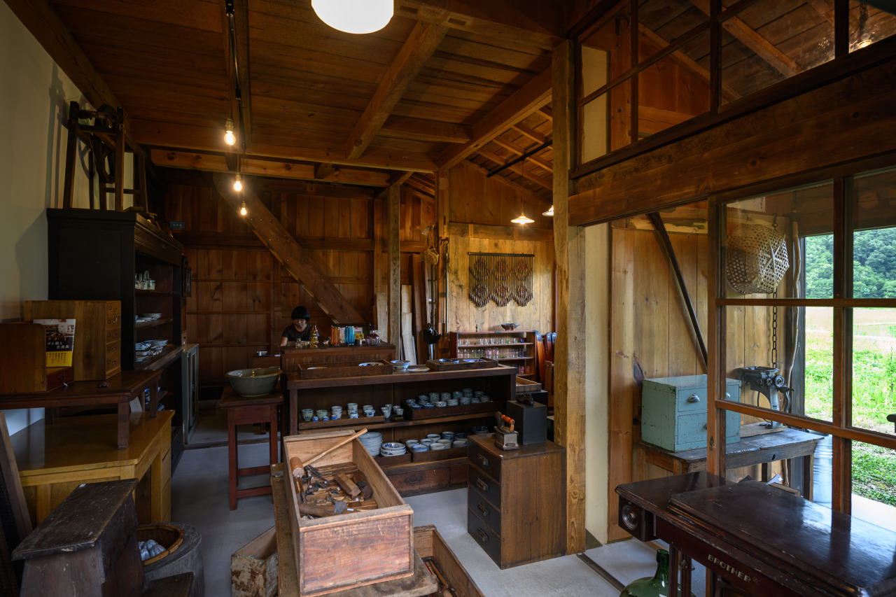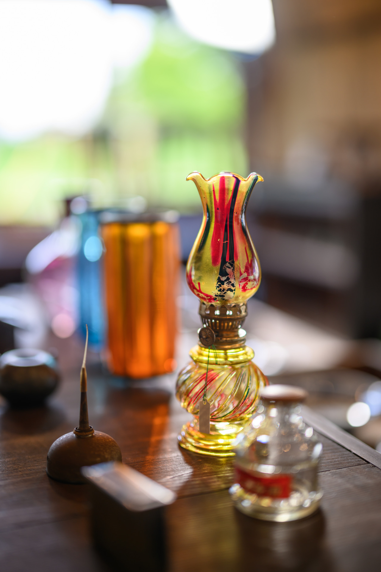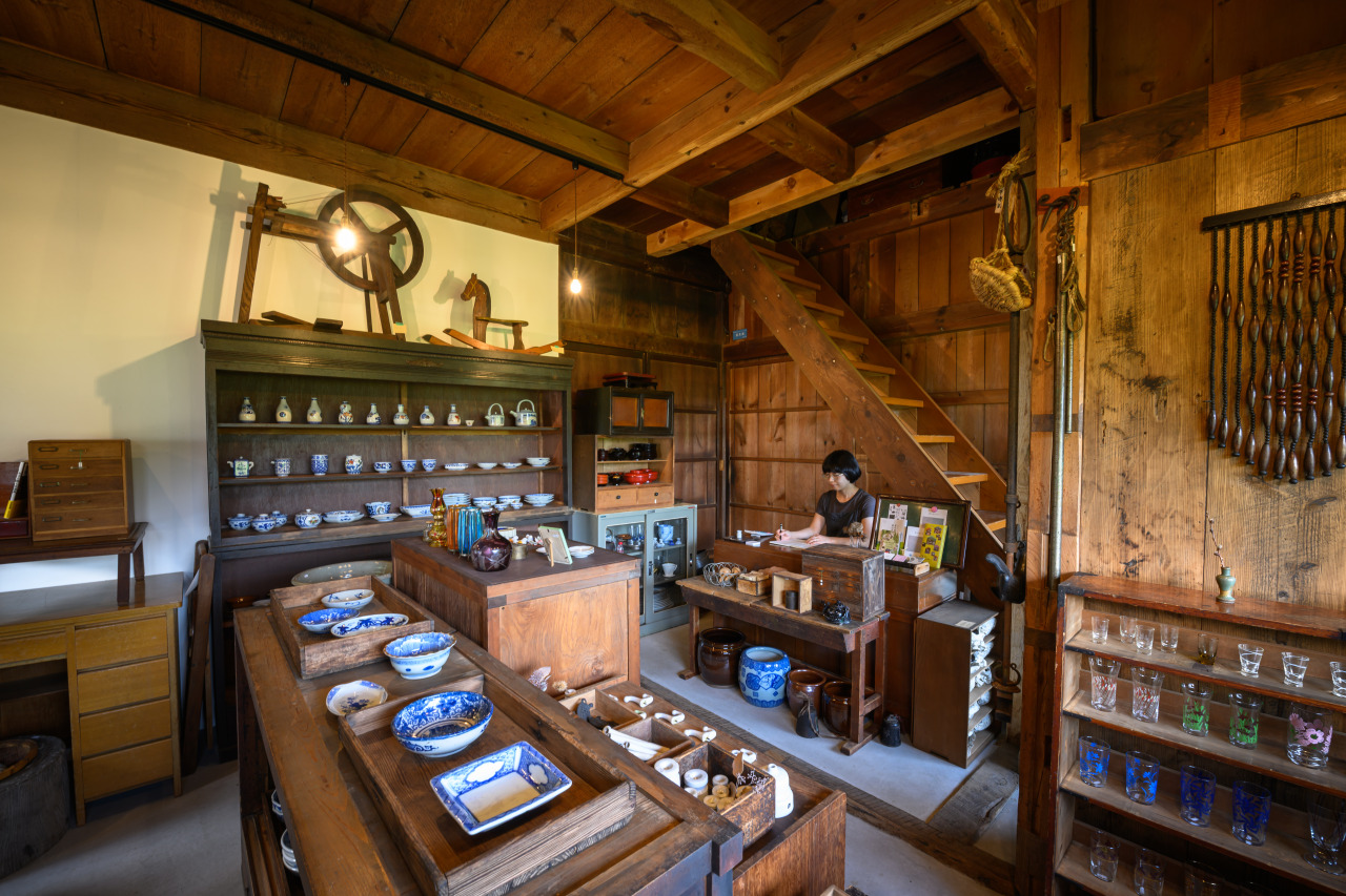 「古道具あぶらや」は、まるで時を旅するような場所。明治〜昭和期にかけての暮らしの道具や、渋草焼・飛騨春慶・小屋名しょうけといった伝統工芸が並びます。さらに陶磁器、ガラスのランプ、小物入れ、箸置きなど、生活を彩る古き良き品々が所狭しと並び、その光景はまるで宝石箱のよう♪