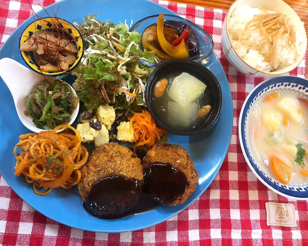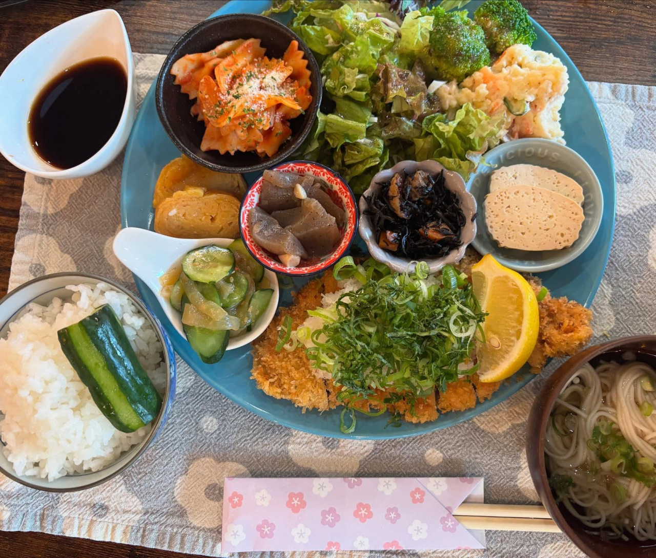 食堂カフェ菊屋は、ランチが人気のお店です。メイン料理に加えて、地元の野菜を使った小鉢をいくつも味わうことができ、バランスよく食べたい方や、地元食材を気軽に楽しみたい方に好評です。