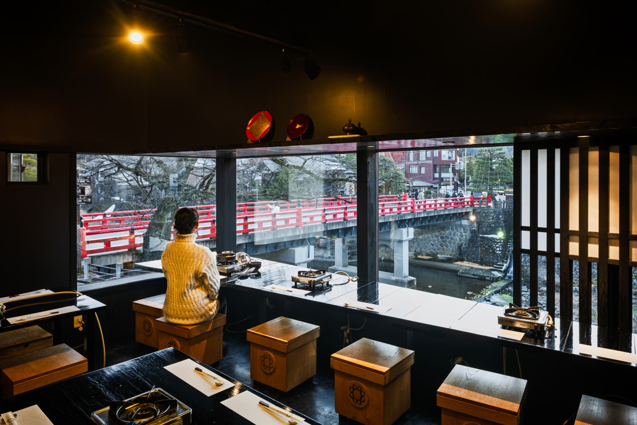 中橋のすぐそばで飛騨牛を食べるならここ。飛騨高山のシンボルのひとつ、赤い中橋 を眺めながらA5ランクの飛騨牛を味わえるお店「飛騨牛すきやきしゃぶしゃぶ 中橋 わかちや」。