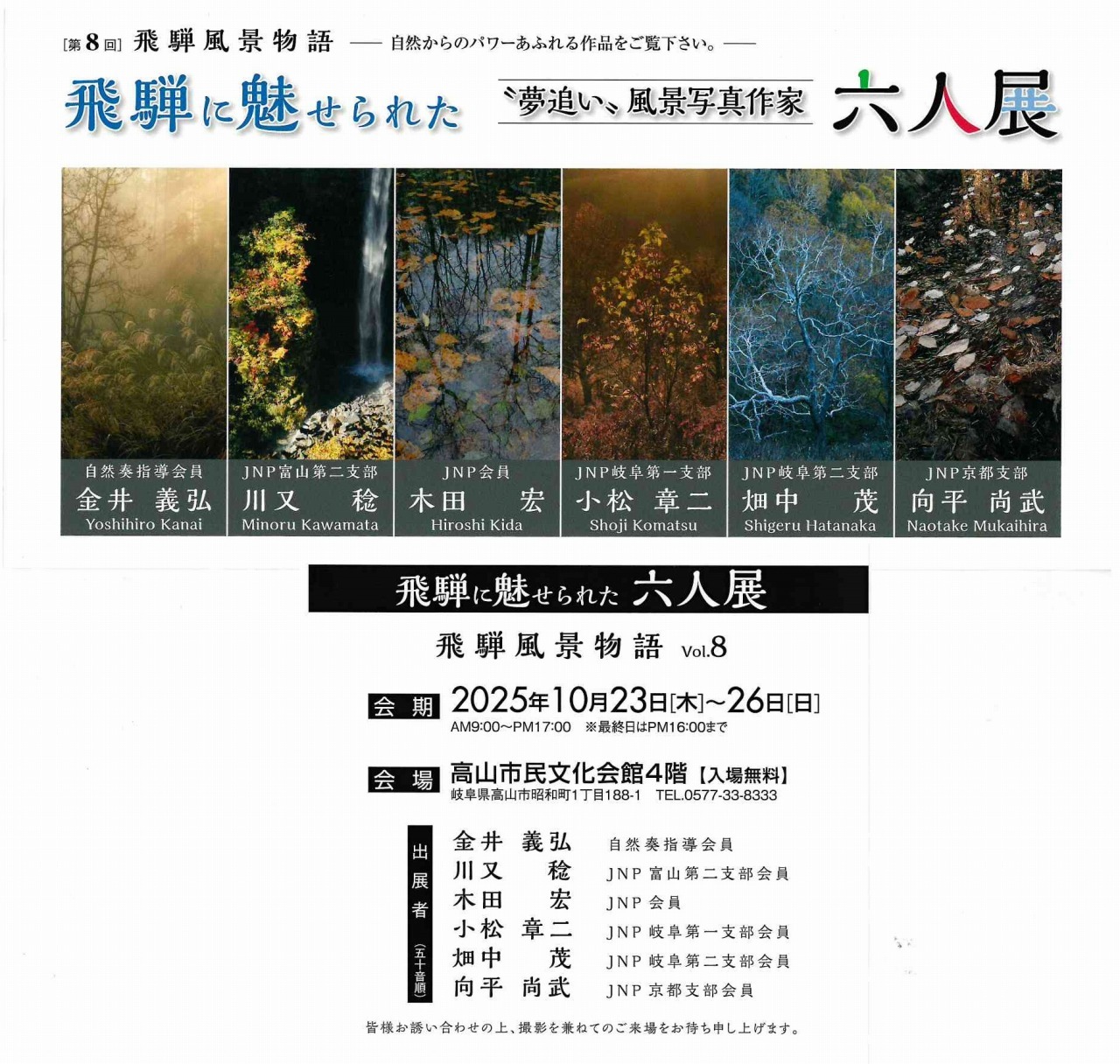 10/23(木)~26(日)第8回 飛騨に魅せられた六人展 スライドショー お気に入り 基本情報 開催期間 2025年10月23日~2025年10月26日 開催場所 高山市民文化会館 4階大会議室 所在地 岐阜県高山市昭和町1丁目188−1 WEBサイト https://www.takayama-bunka.org/events/20251023-26rokunin/