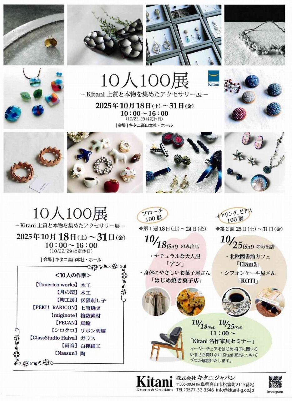 10/18(土)~31(金)10人100展-Kitani 上質と本物を集めたアクセサリー展- スライドショー お気に入り 基本情報 開催期間 2025年10月18日~2025年10月31日 開催場所 キタニ高山本社 ホール 所在地 岐阜県高山市松倉町2115 WEBサイト https://www.takayama-bunka.org/events/20251018-31kitani/