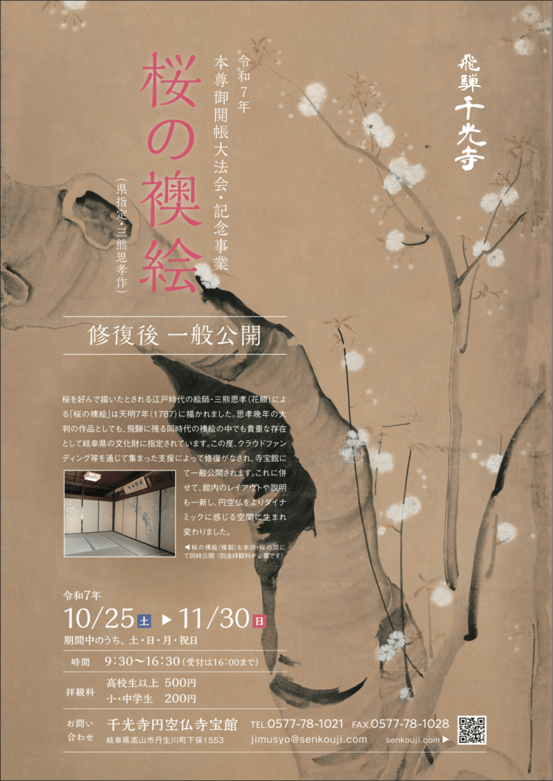 令和7年度開催の本尊御開帳大法会記念事業として、江戸時代の絵師・三熊思孝(花顛)の桜の襖絵の修復事業を完了し、円空仏寺宝館にて常設一般公開を行っております。