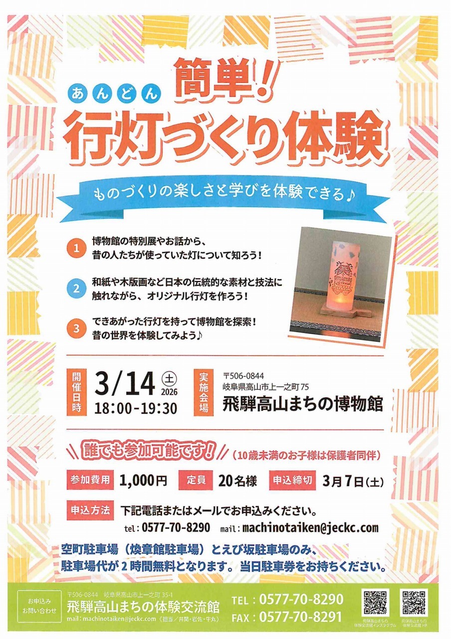 3/14(土) 簡単!行灯づくり体験 スライドショー お気に入り 基本情報 開催期間 2026年3月14日 開催場所 飛騨高山まちの博物館 所在地 岐阜県高山市上一之町75 WEBサイト https://www.takayama-bunka.org/events/20260314andon/