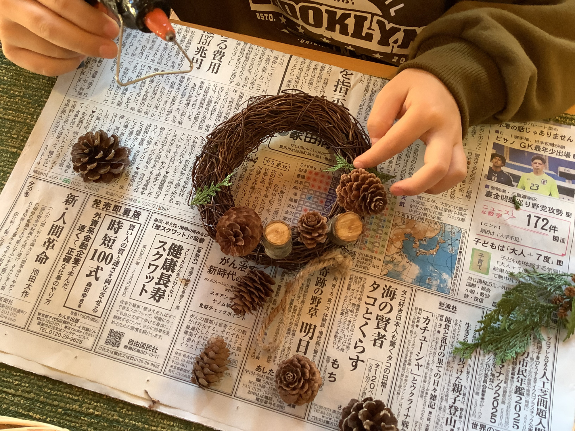 森のリースづくり 自然の恵みをたっぷり使って、あなただけのリースづくりを楽しみませんか?お子さまから大人までお楽しみいただけます。グルーガンを使いますので、小さいお子さまは大人の方と一緒に作ってくださいね。体験料 550円開館中はいつでも体験できます!お気軽にスタッフにお声がけください。