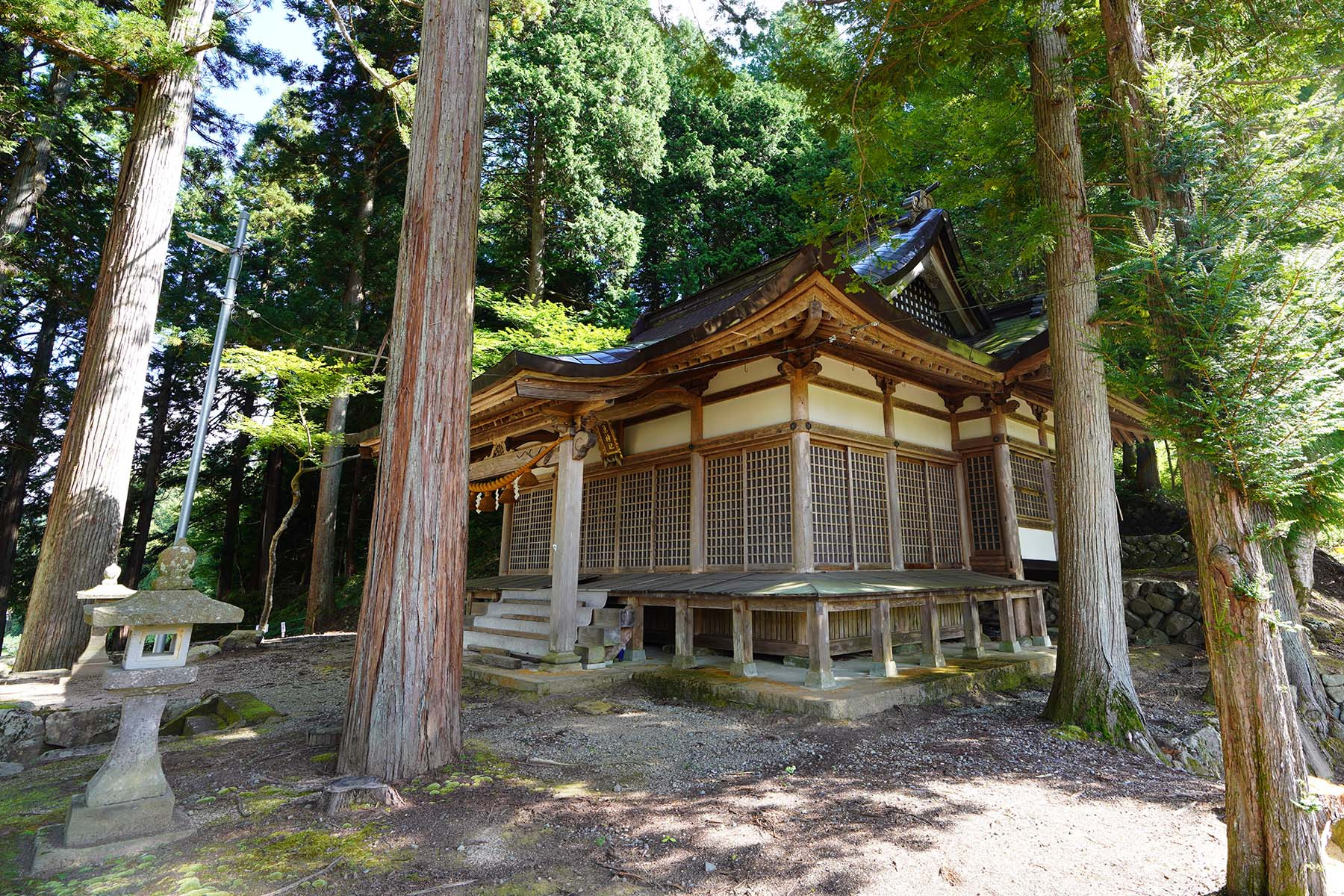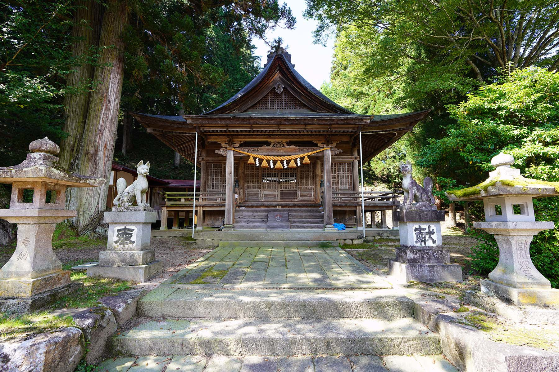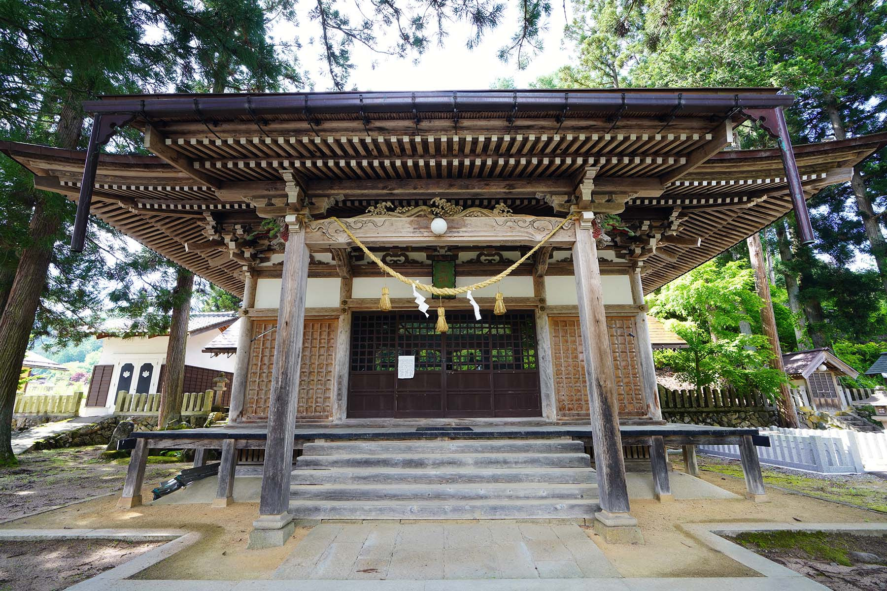 | 例祭の見どころ | 午前 鉦打ち(小・中学生)、獅子舞(若社連)の村回り 午後 公民館から神社まで行列 当神社にて例祭を斎行(14:00) 浦安の舞、神楽獅子、鉦打ちを奉納 |