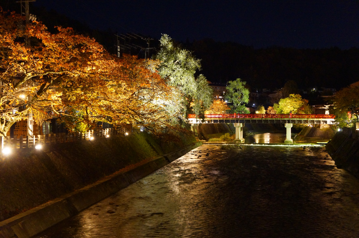 市内の中心部を流れる宮川にかかる「中橋」。赤い橋と周囲の自然が溶け込んだ様は飛騨高山の代表的な風景の1つに数えられています。四季を通じてライトアップされており、春は桜、夏は深緑、秋は紅葉、冬は雪景色と折々の風景が夜景に浮かび上がります。
