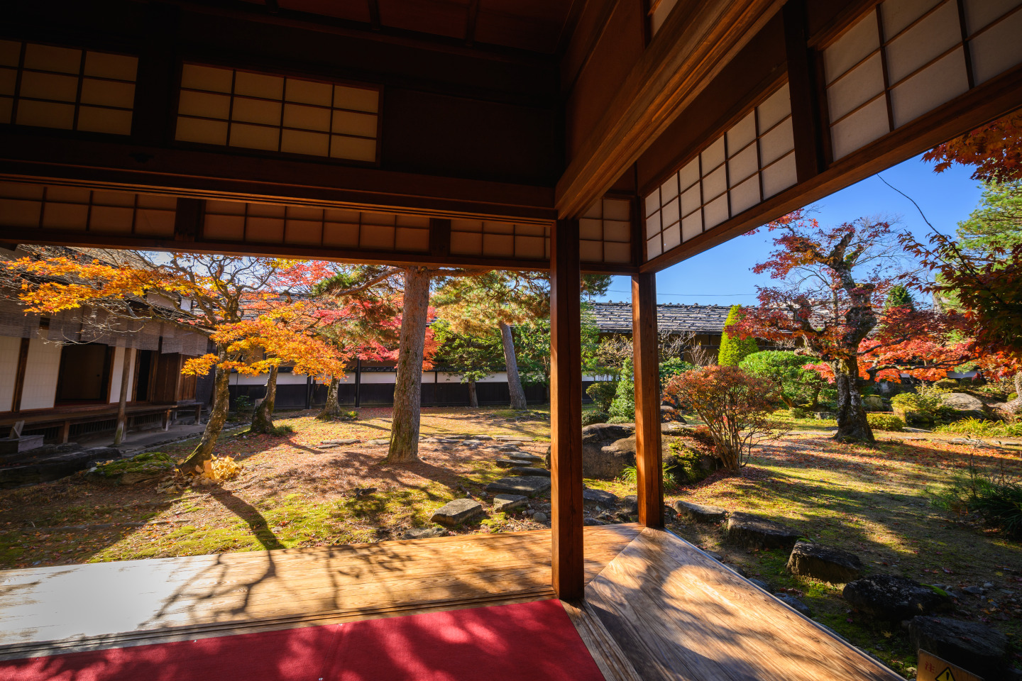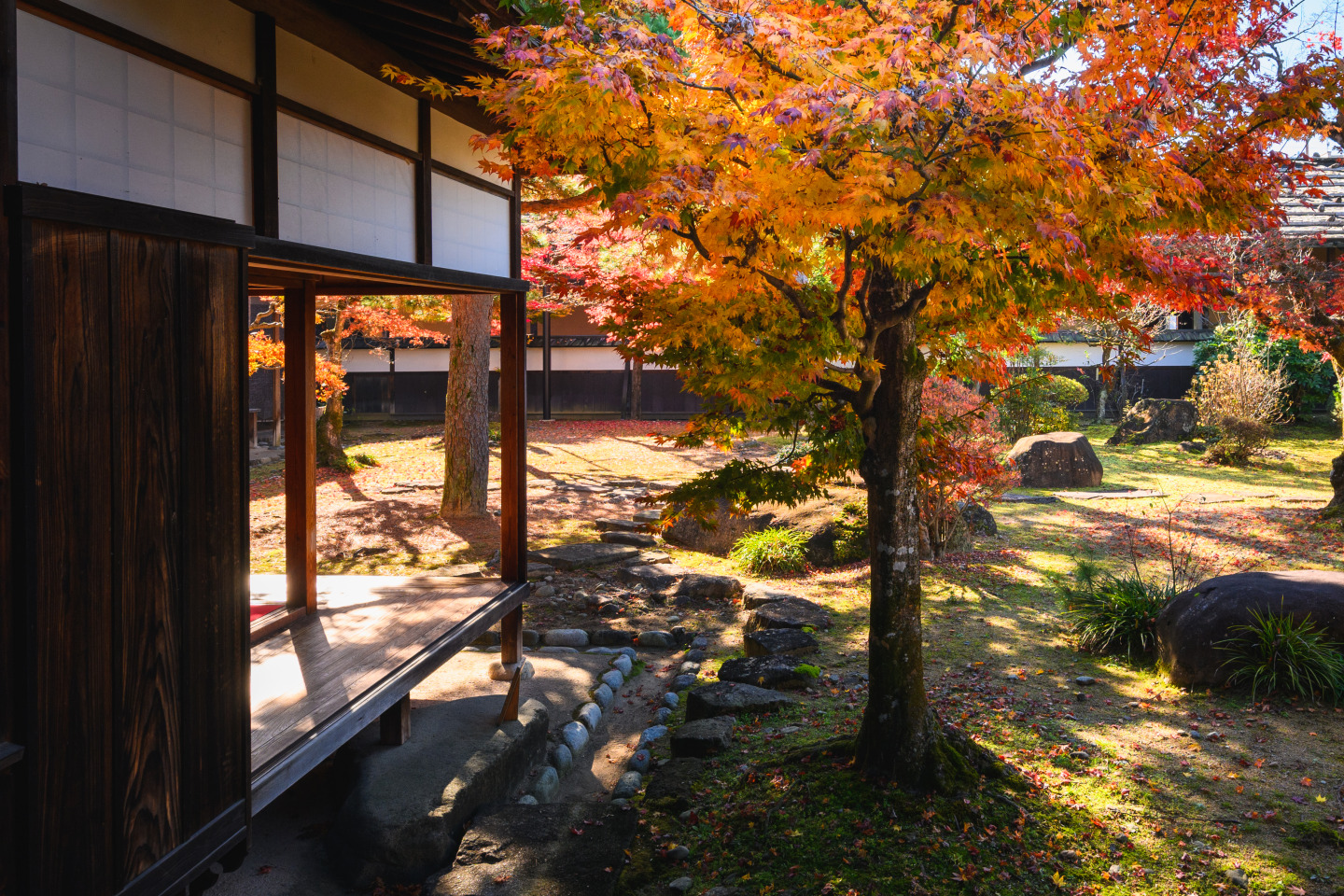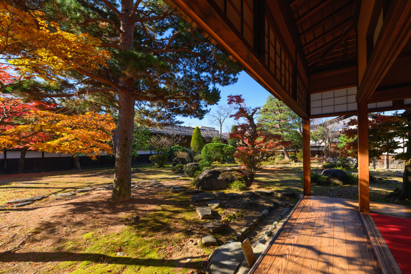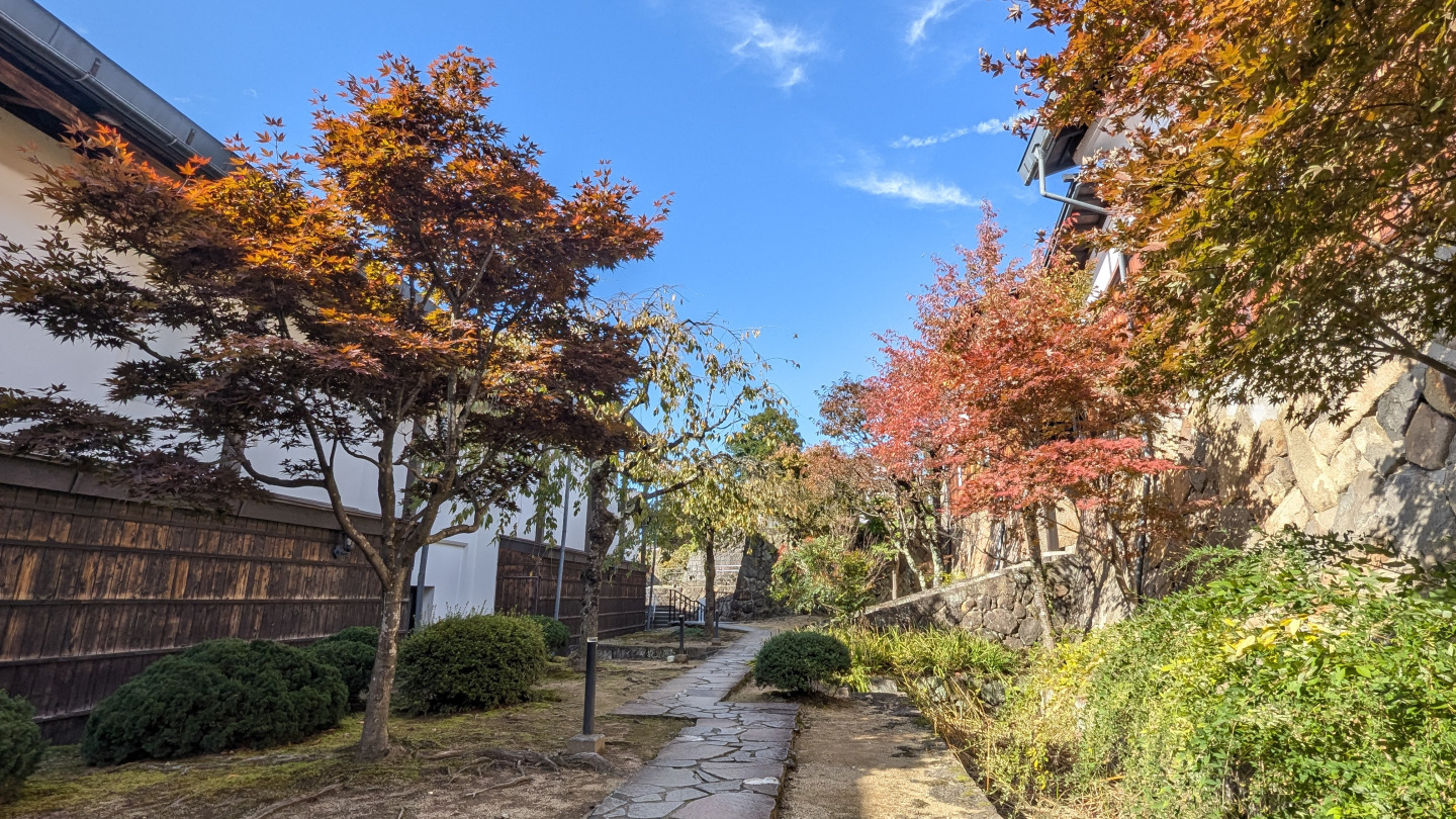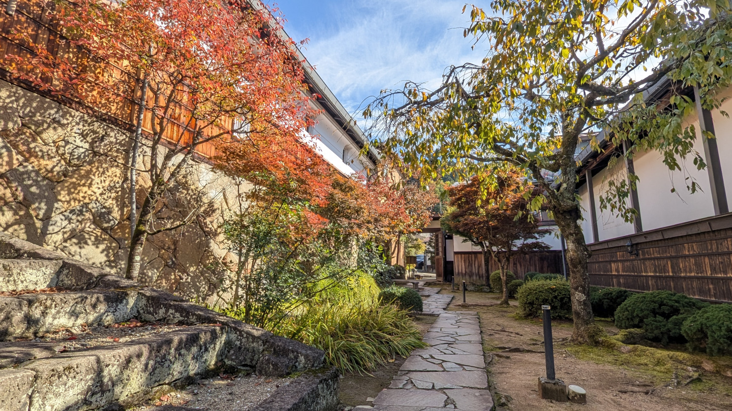 手入れされた中庭は秋になると美しく赤、黄に染まり、訪れる人の目を楽しませます。飛騨高山らしさを感じられるオススメの場所です。