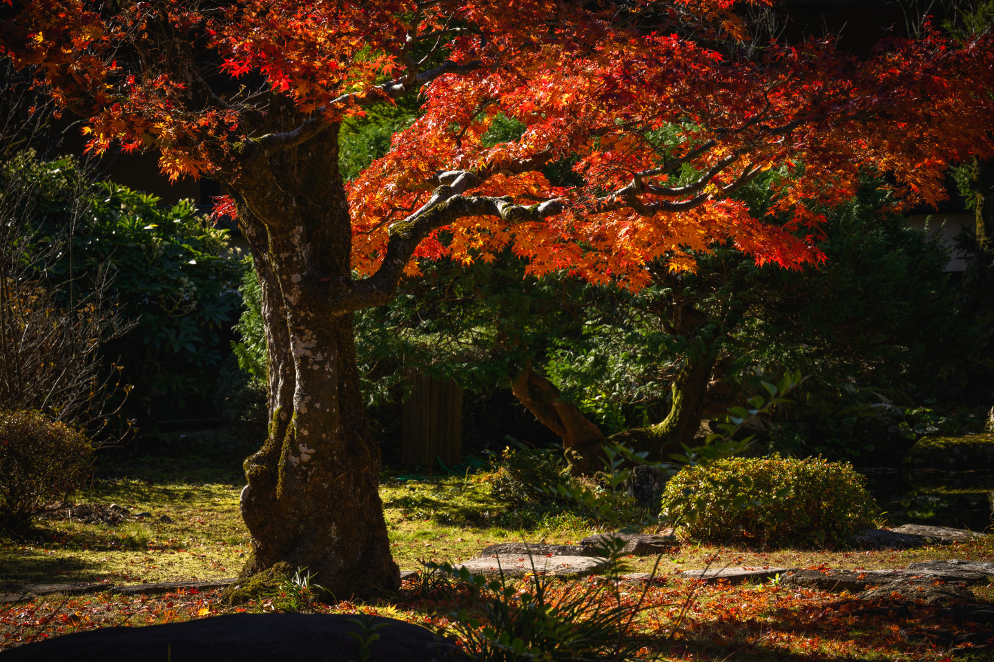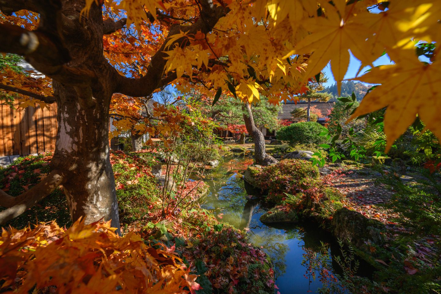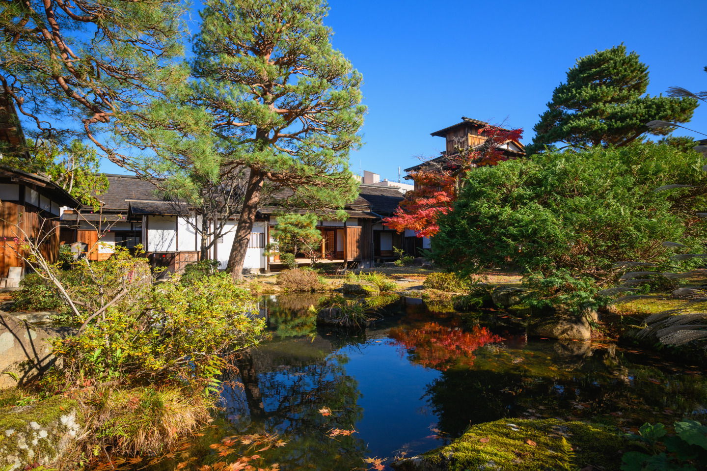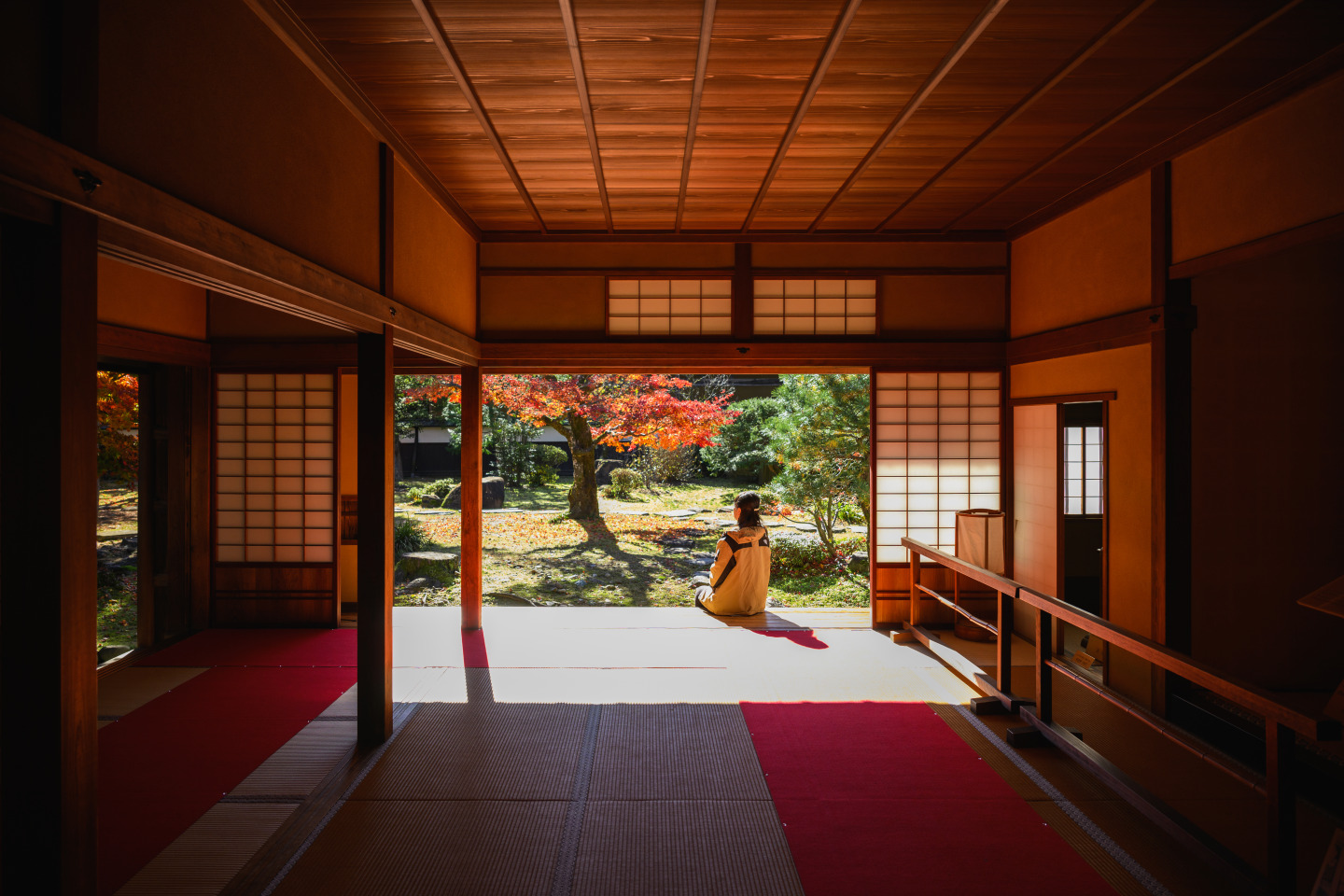 手入れされた中庭は秋になると美しく赤、黄に染まり、訪れる人の目を楽しませます。飛騨高山らしさを感じられるオススメの場所です。
