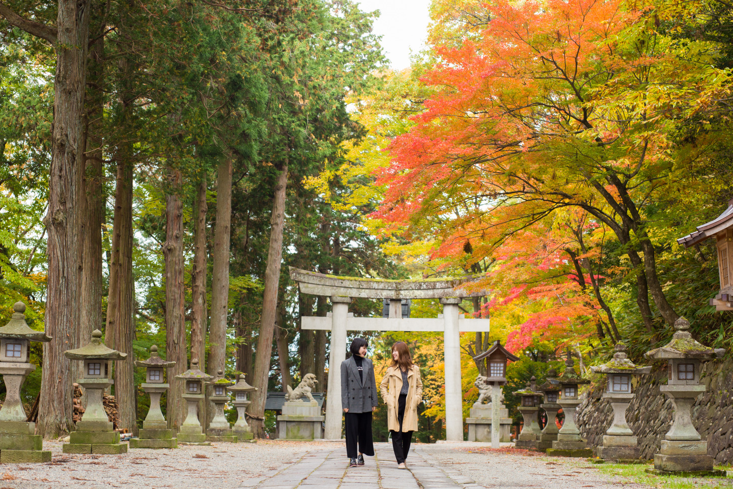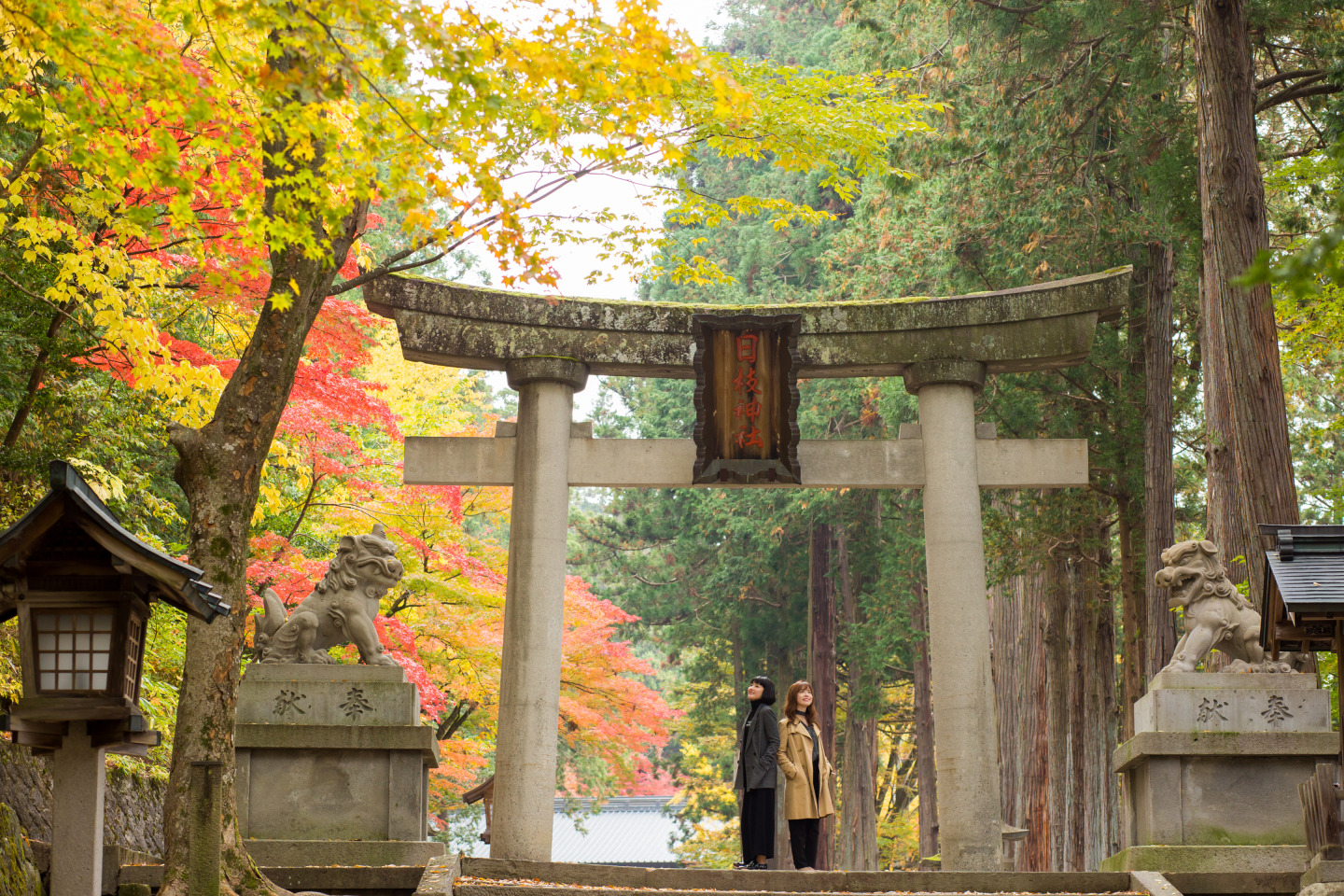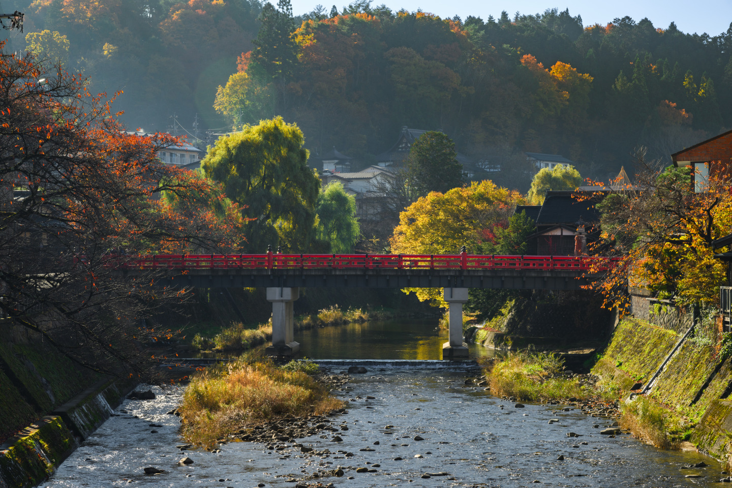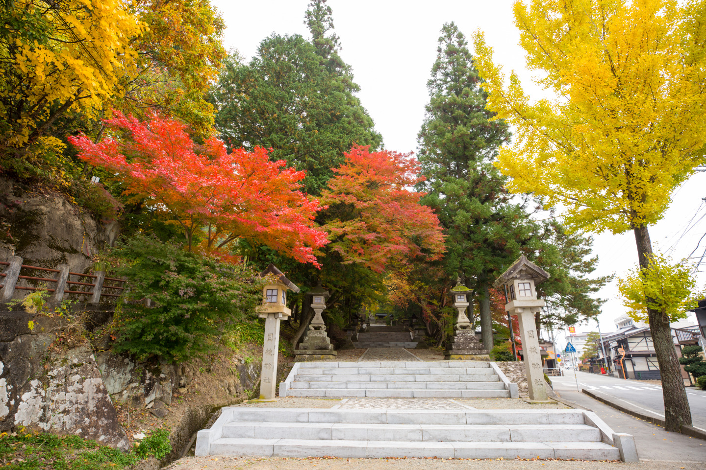 中橋を右に折れ、川沿い~通り沿いに歩き徒歩10分。紅葉が美しいことで知られる日枝神社(ひえじんじゃ)に到着。春の高山祭の例祭場所として有名な神社です。880年もの由緒を誇る古社は、木々が生い茂り、中には樹齢1000年以上のものも。 鮮やかに赤く染まった木々の間を散策すると澄んだ清らかな気持ちになります。