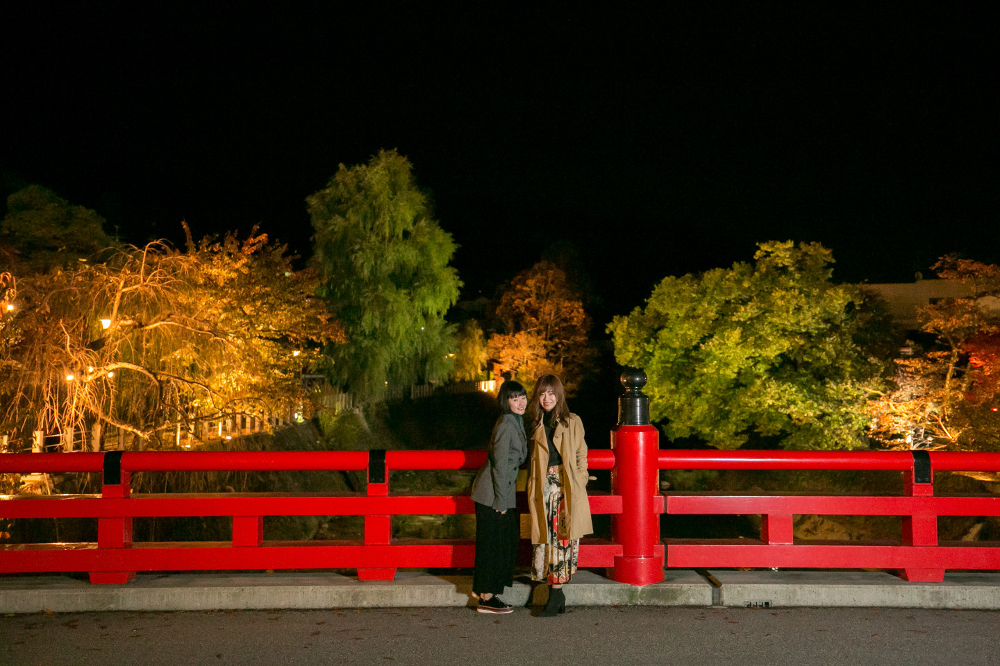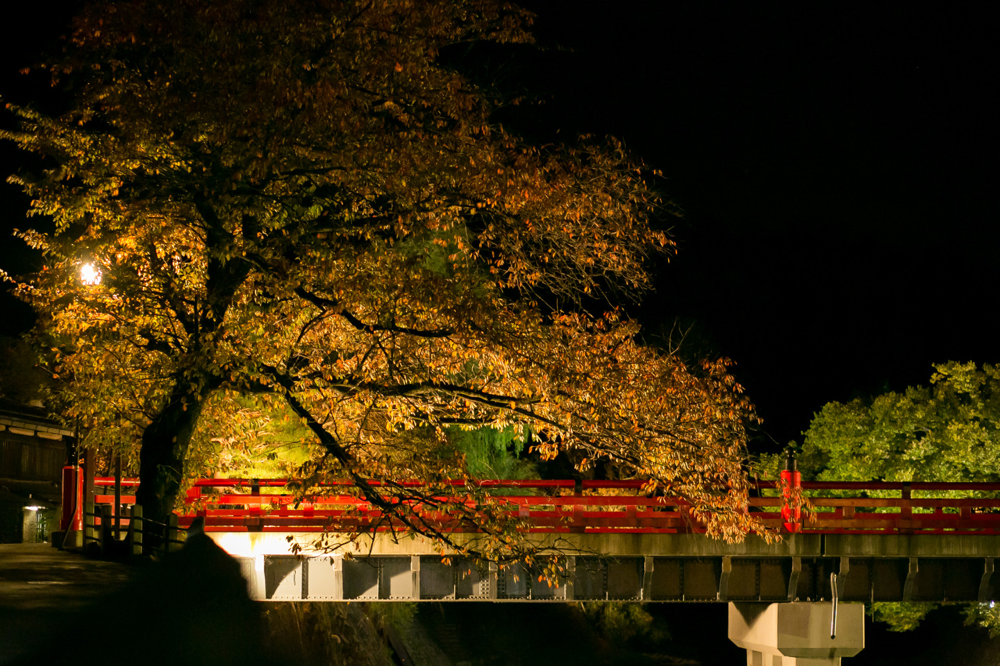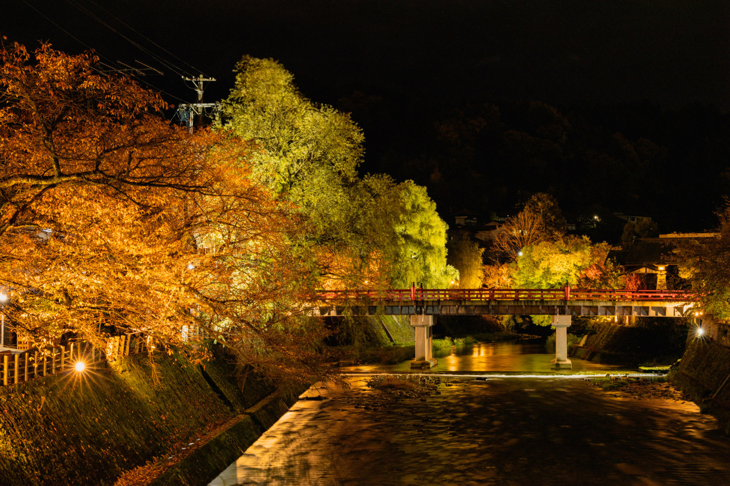 高山陣屋から徒歩1分。市内の中心部を流れる宮川にかかる「中橋」。赤い橋と周囲の自然が溶け込んだ様は飛騨高山の代表的な風景の1つに数えられています。春には桜の名所、秋には紅葉の名所として知られ、人気写真スポットです。旅行客だけではなく、高山市民も結婚式、成人式と言った折々で写真を撮りに訪れます。カメラが好きな方には中橋下流の筏橋から望むアングルが良いショットとして知られています。春夏秋冬、周辺をライトアップしており、四季折々の幻想的な風景を見ることができます。