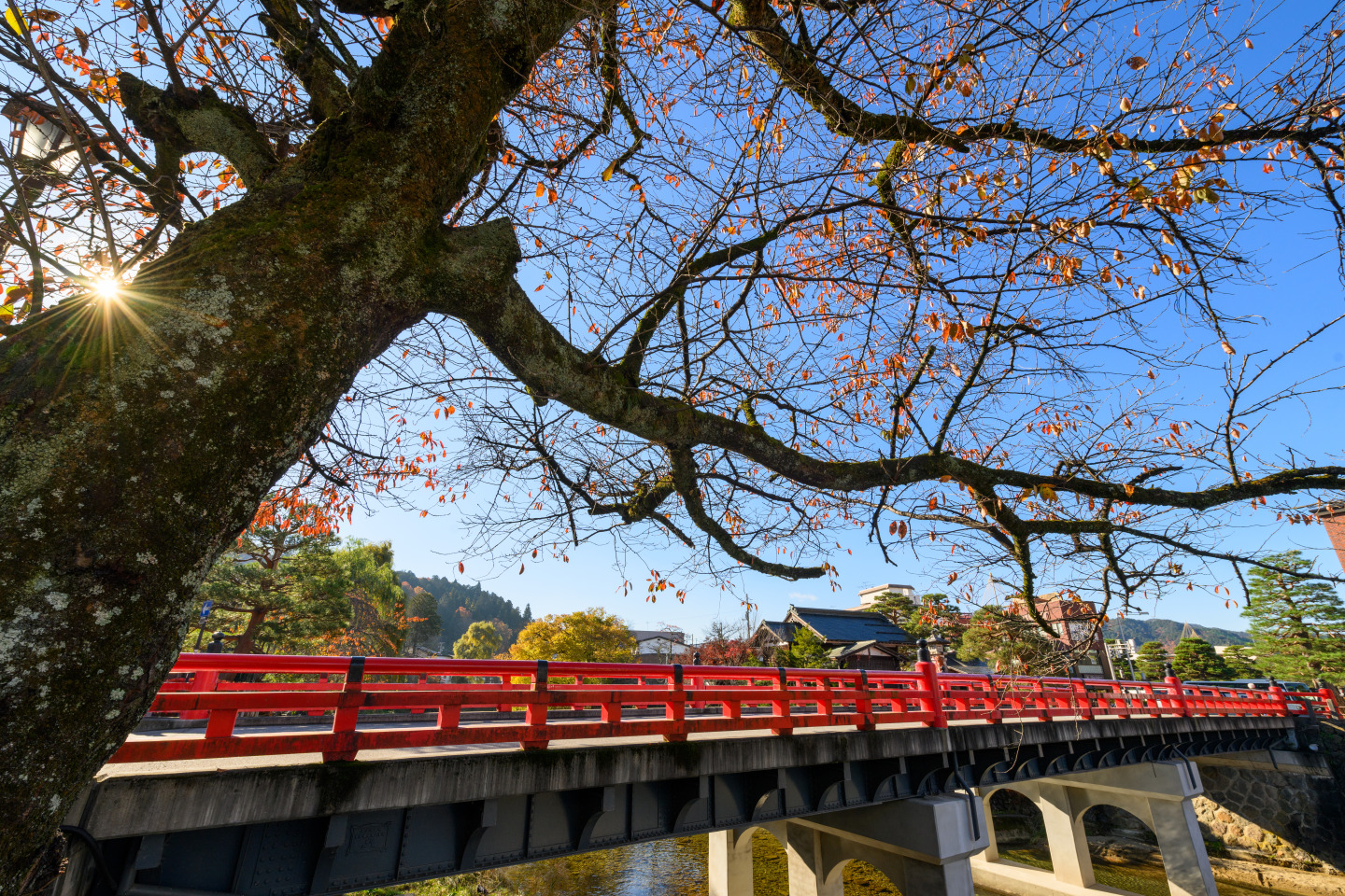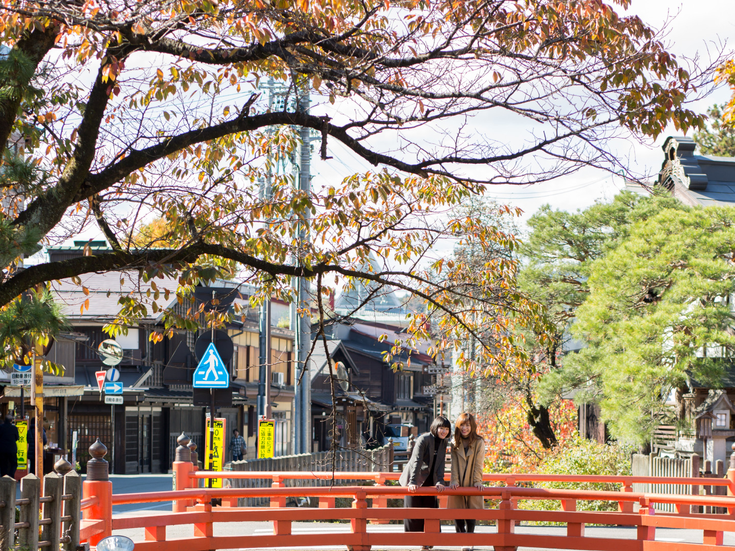 高山駅から徒歩10分。市内の中心部を流れる宮川にかかる「中橋」。赤い橋と周囲の自然が溶け込んだ様は飛騨高山の代表的な風景の1つに数えられています。春には桜の名所、秋には紅葉の名所として知られ、人気写真スポットです。旅行客だけではなく、高山市民も結婚式、成人式と言った折々で写真を撮りに訪れます。春夏秋冬、周辺をライトアップしており、四季折々の幻想的な風景を見ることができます。