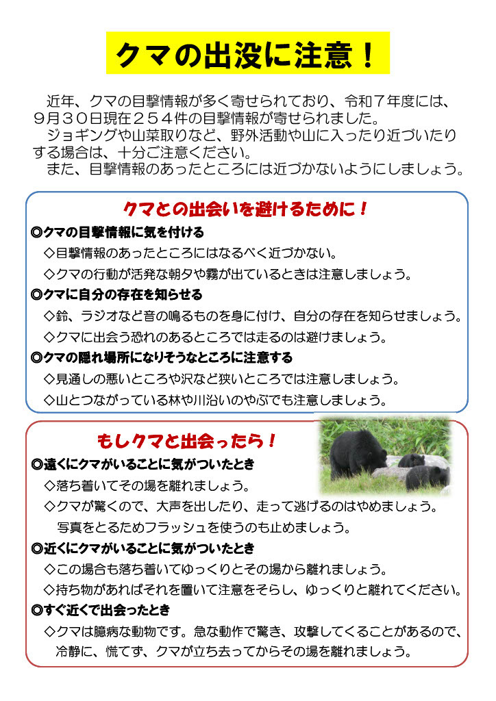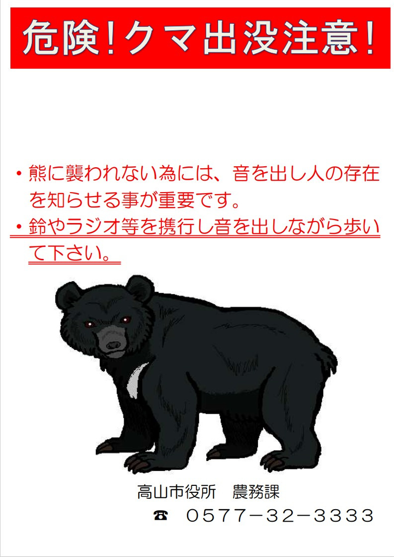 【ご注意ください】クマの目撃情報について 2025.10.07 check お知らせ 近年、高山市内において継続的にクマが出没しており、近くに潜んでいる可能性があります。大変危険ですので、一人での外出はできる限り控えるなど十分にご注意ください。お問合せ先:高山市農務課 0577-35-3141 関連リンク メールマガジンによる緊急情報 一覧に戻る