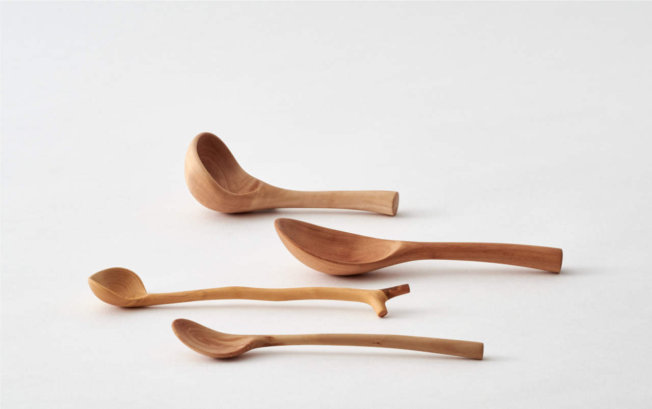 作家が粗削りした枝のスプーンから好きな形や材料を選び、紙やすりとオイルを使用し、磨いて完成させます。木の自然な形を活かした、世界に1つだけのスプーンを作ることができます。