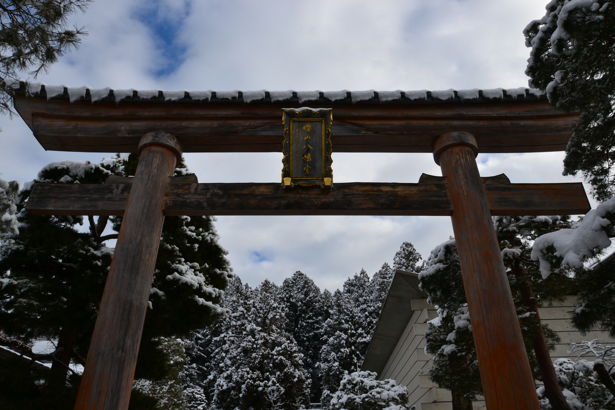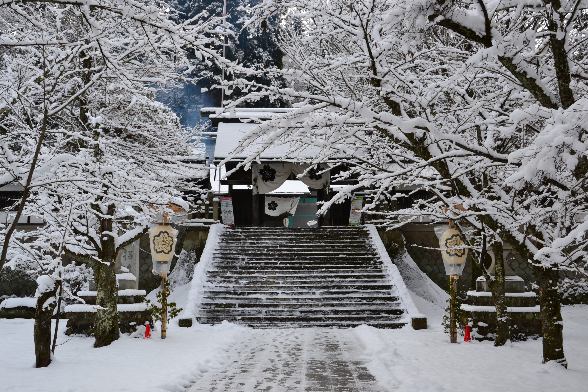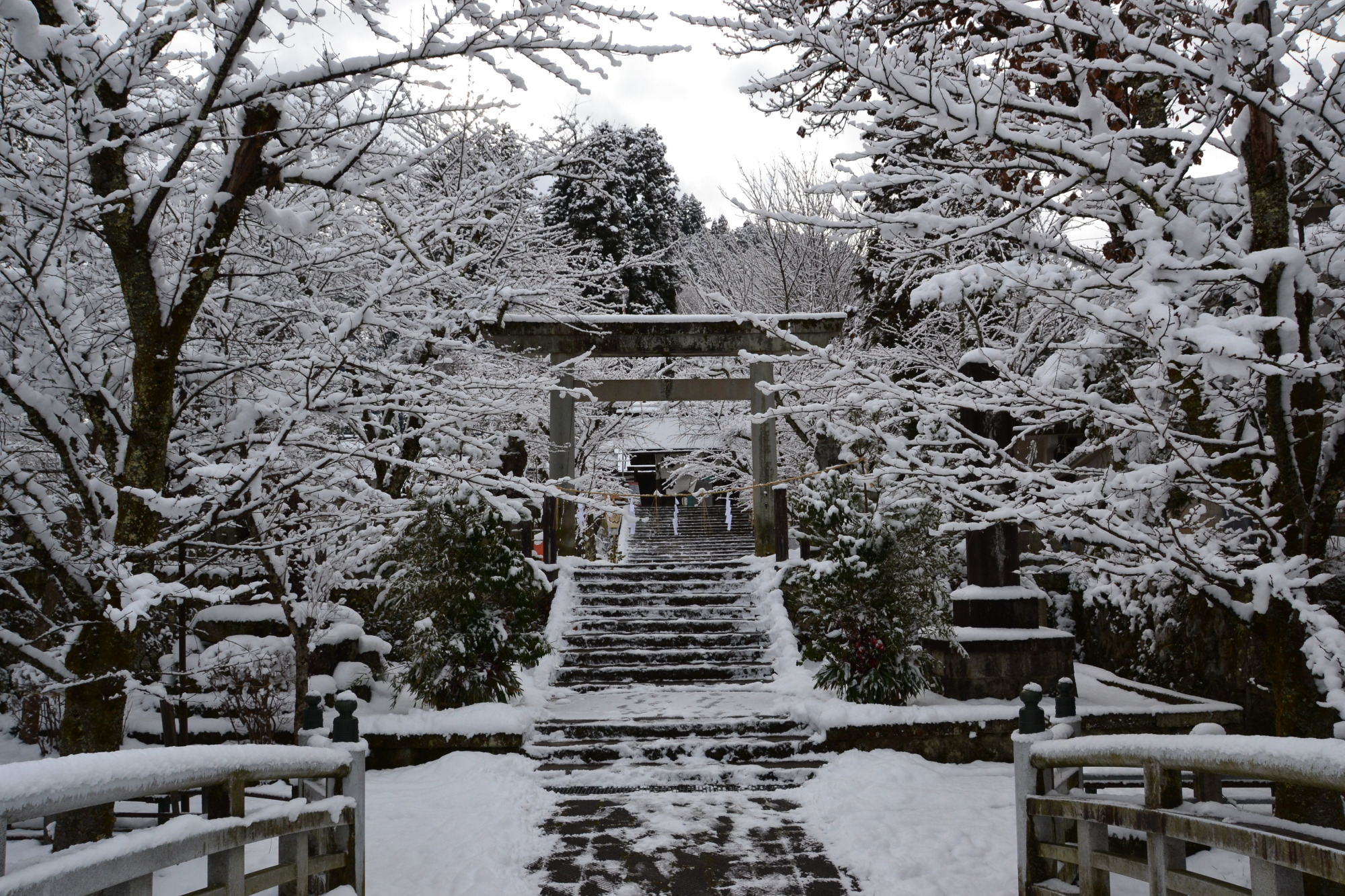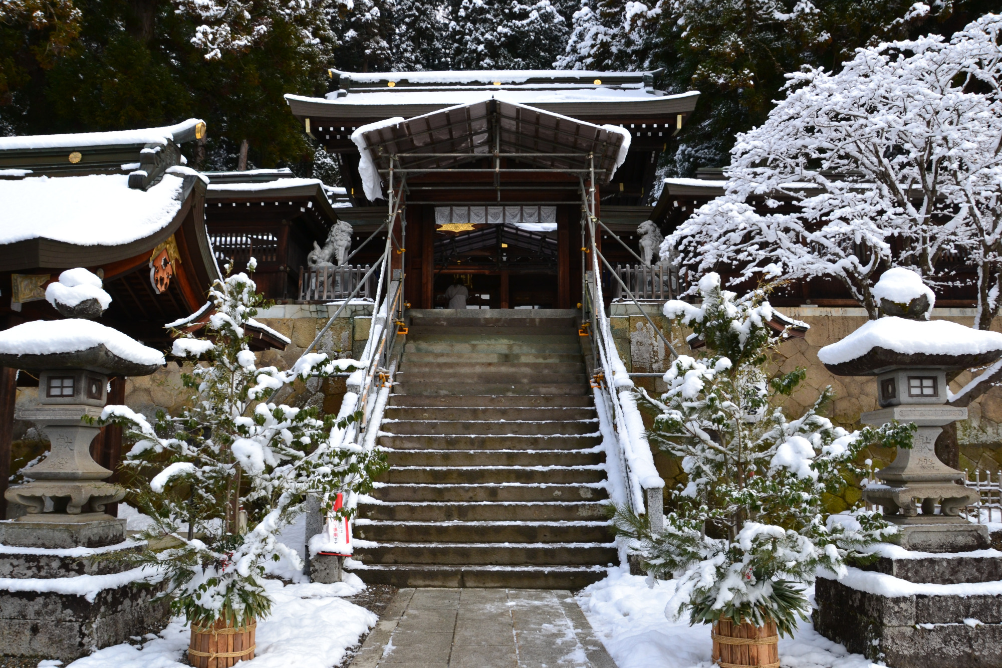 岐阜県に三社ある護国神社の内の一つ「飛騨護国神社」。西南の役以降に戦没した6525柱もの飛騨出身者を祭神として祀っています。お宮の周囲は池と多くの樹々に囲まれ、枝々に積もった雪がまるで花を咲かせているかのよう。春には桜の名所としても知られています。