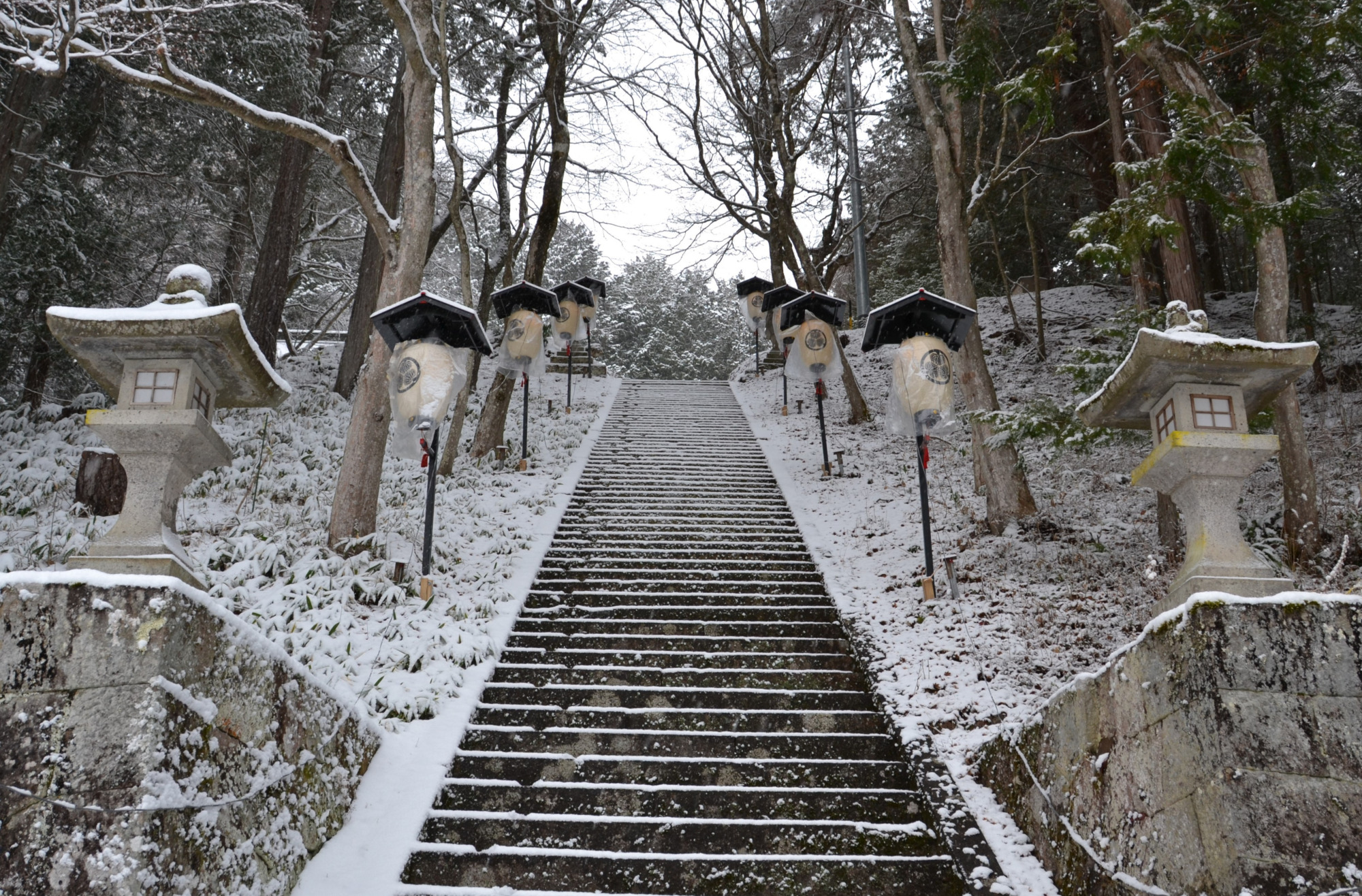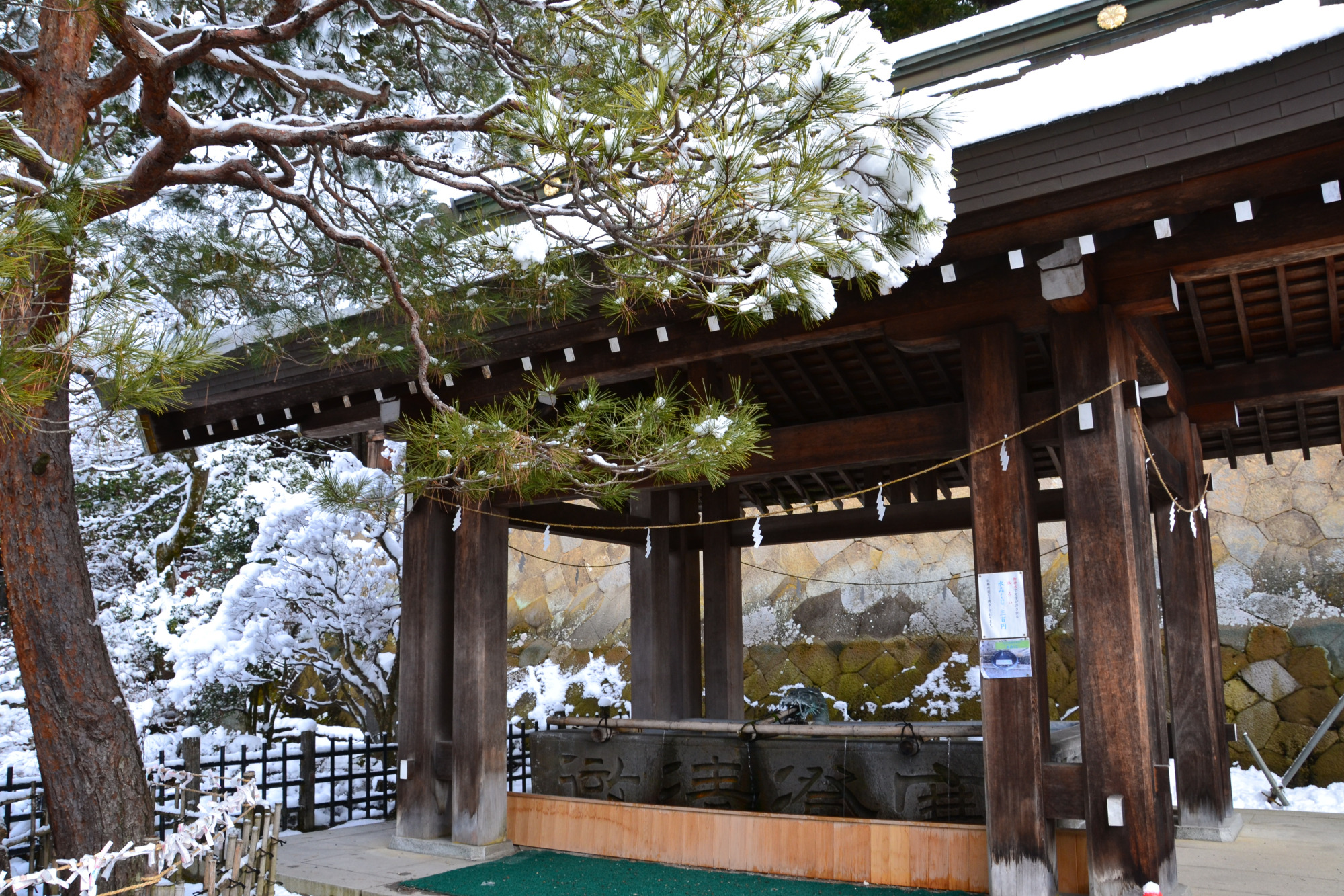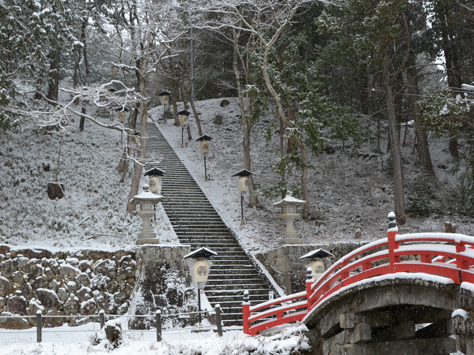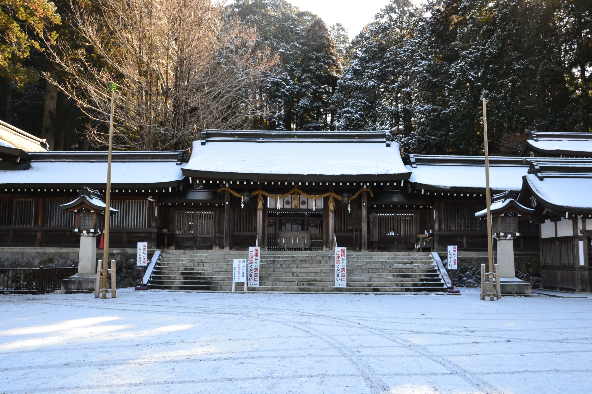 岐阜県に三社ある護国神社の内の一つ「飛騨護国神社」。西南の役以降に戦没した6525柱もの飛騨出身者を祭神として祀っています。お宮の周囲は池と多くの樹々に囲まれ、枝々に積もった雪がまるで花を咲かせているかのよう。春には桜の名所としても知られています。