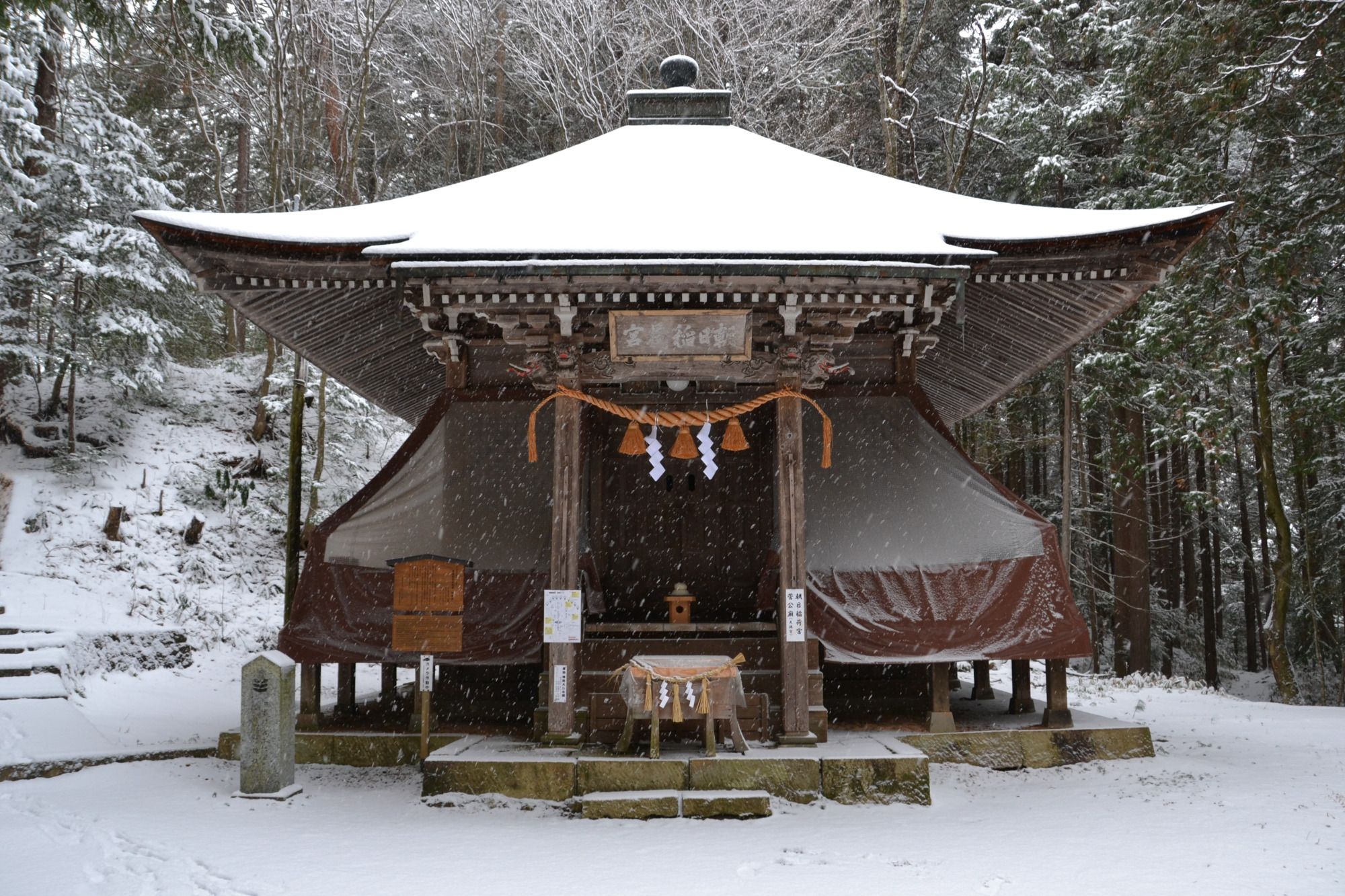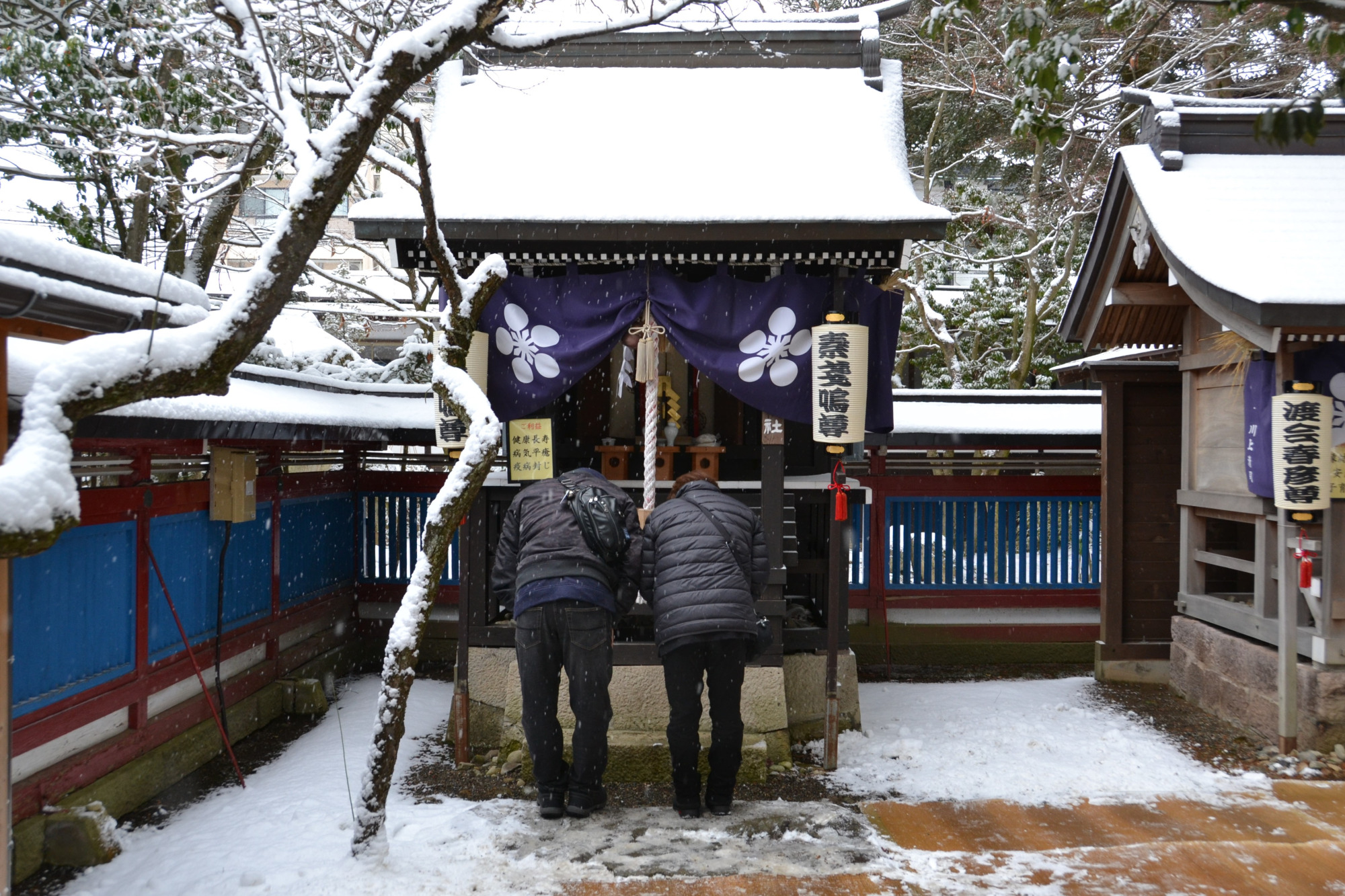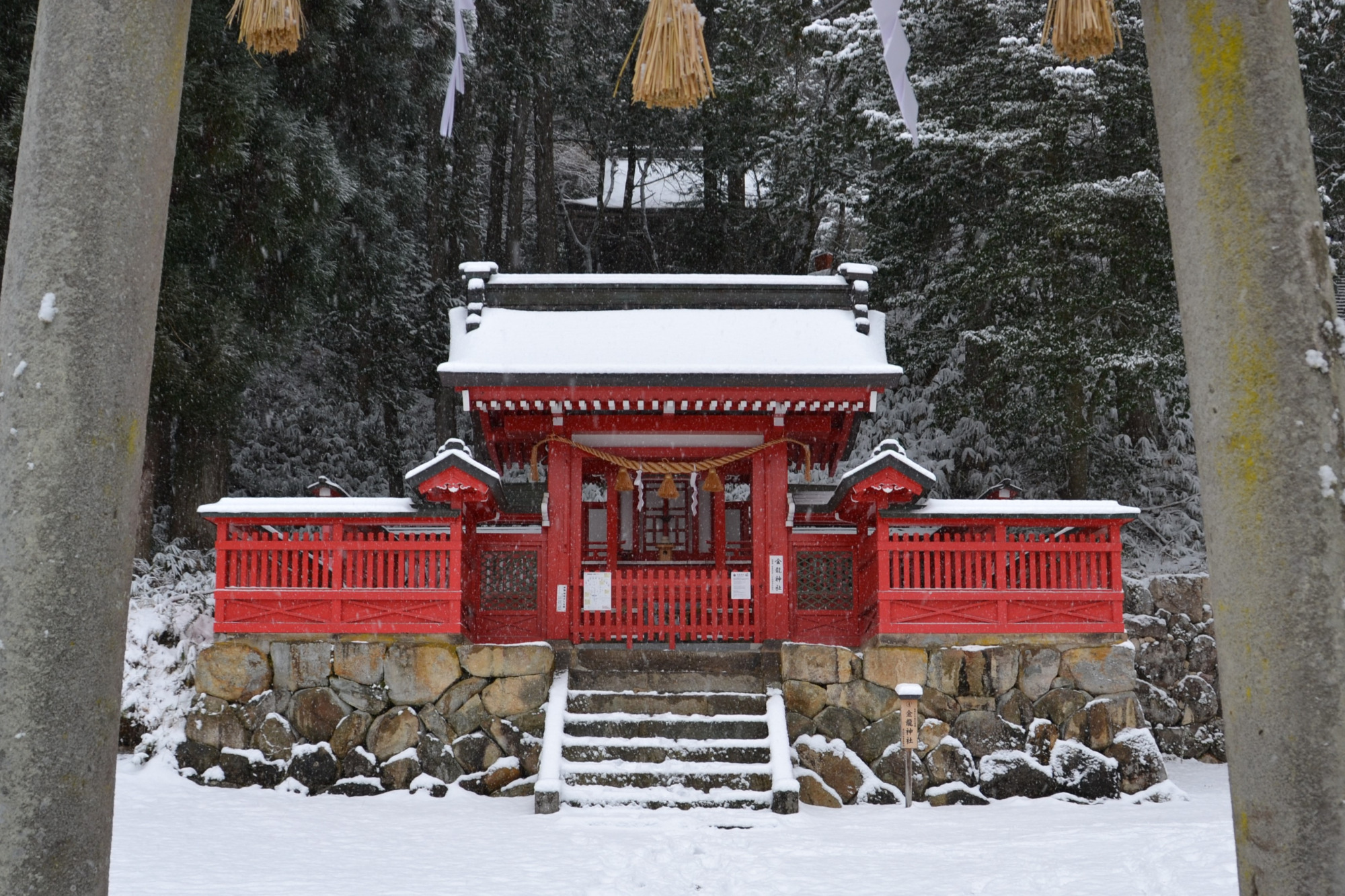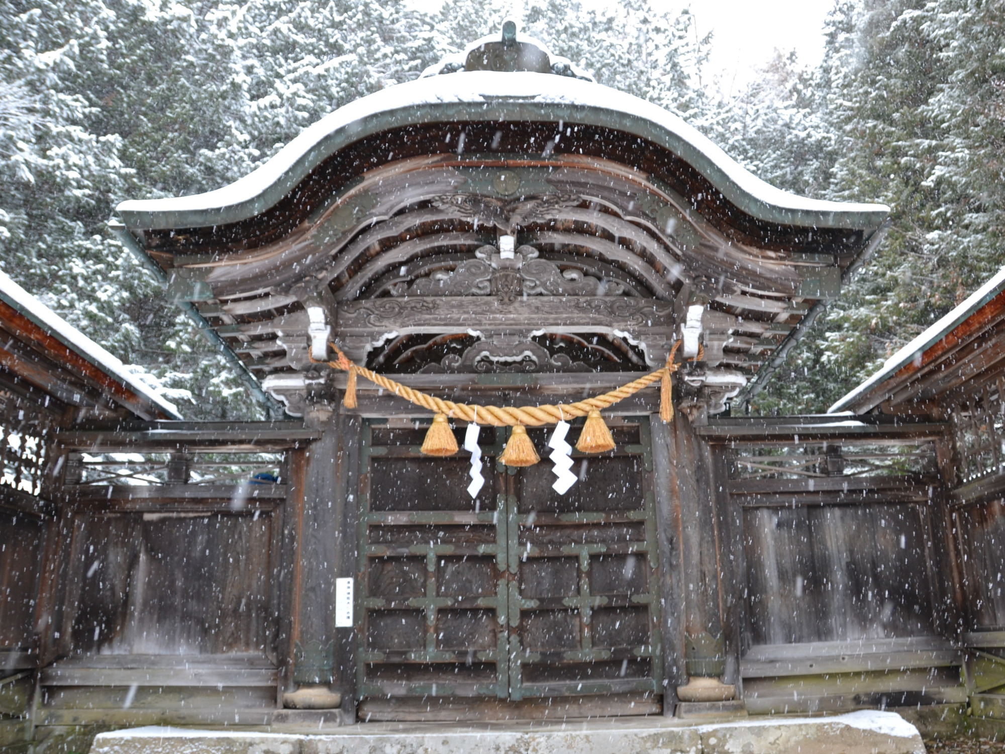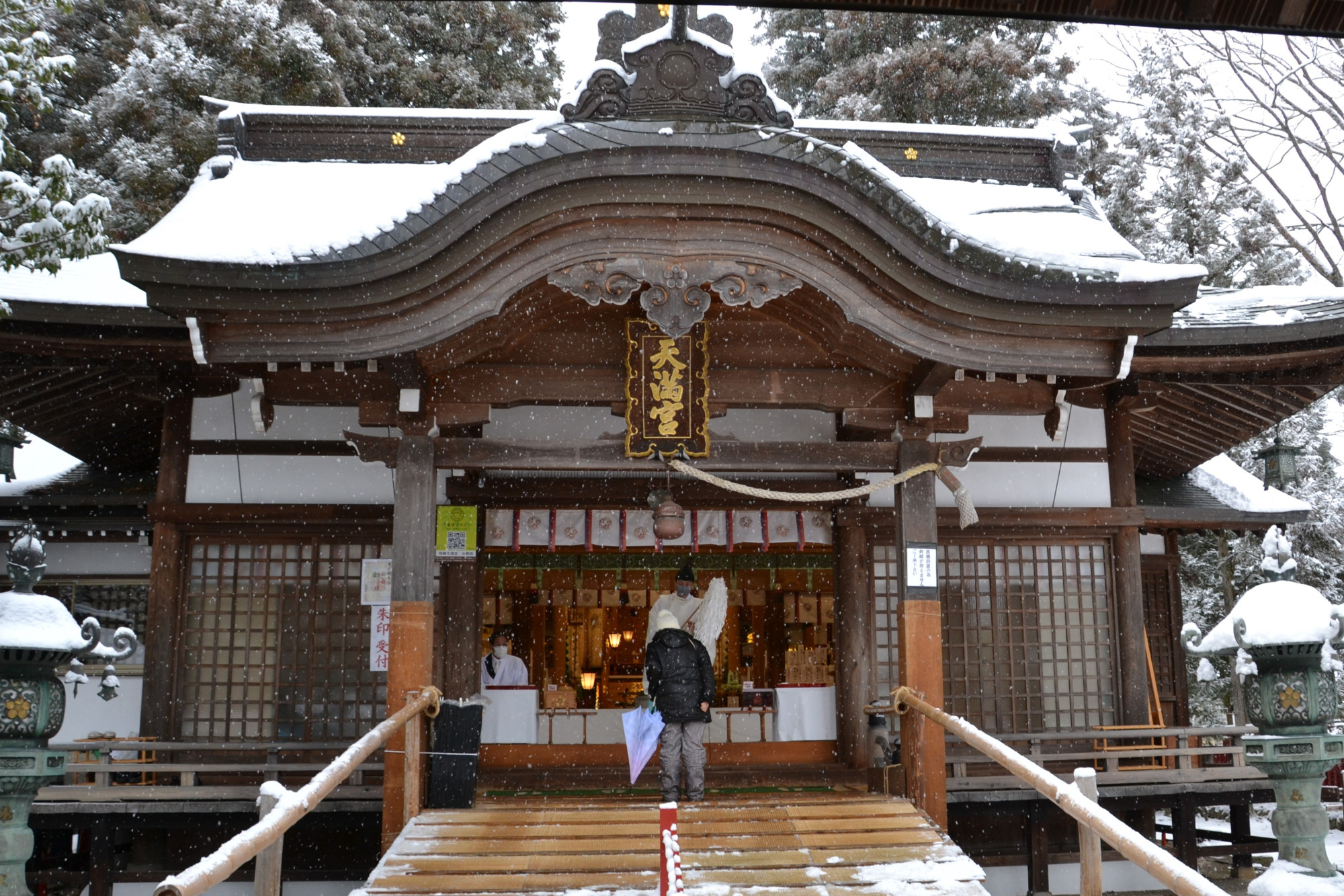大きな鳥居に雪が積もり、初春らしい境内には「秋葉神社」、「天満神社」、「稲荷神社」、「琴平神社」、「照前神社」と5つの末社があり、普段は閉ざされた扉も新年の装いと共に開いている様子が見られます。