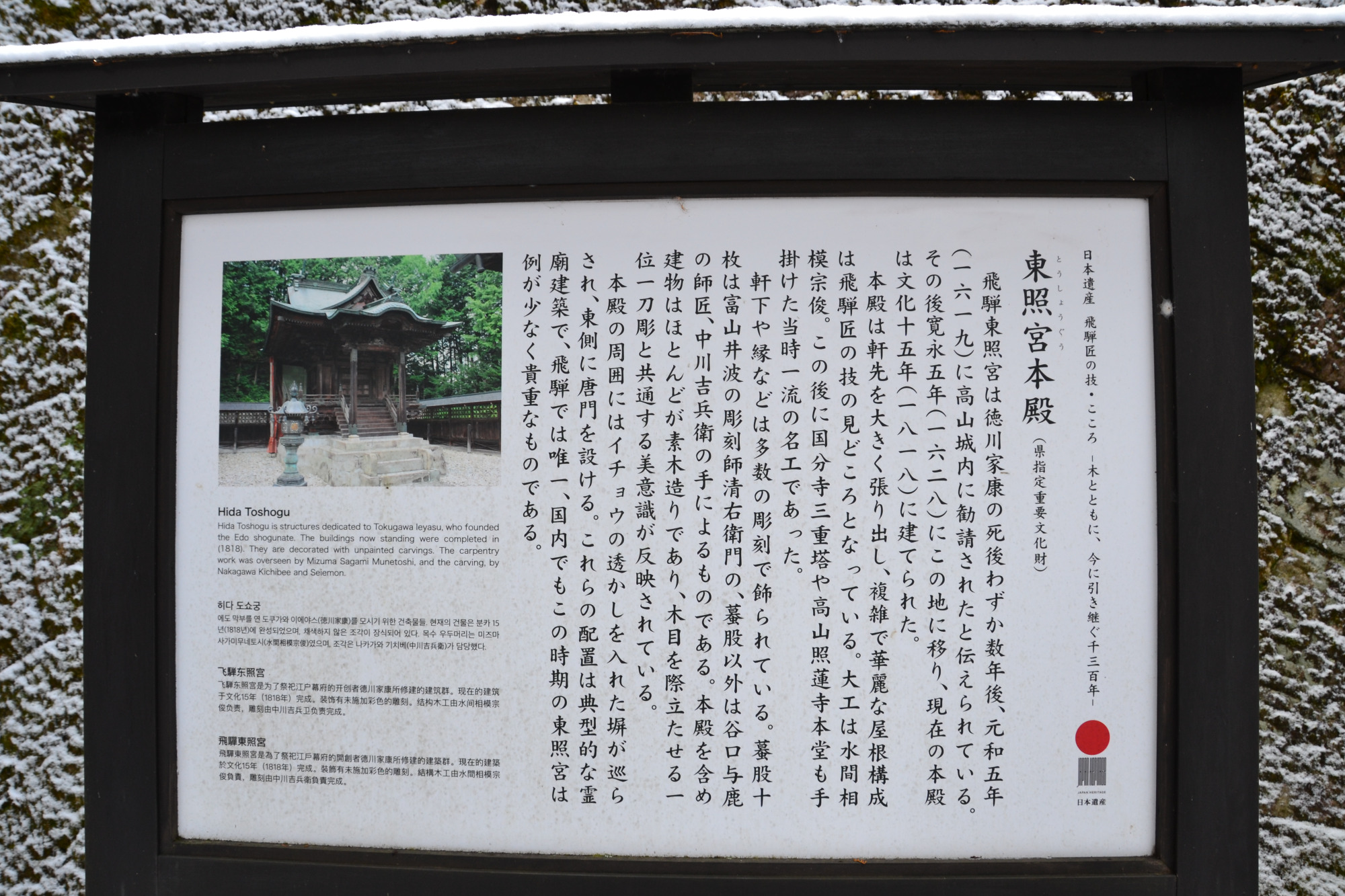 「飛騨東照宮」は1619年飛騨高山藩3代藩主「金森 重頼(かなもり しげより)」によって高山城中に祀ってあった徳川家康公を現在地に遷座したのが創建といわれています。境内には初代藩主「金森長近」を祭る金龍神社もあり、地元の方も多く訪れ大切に愛されている神社です。観光地から少し離れた場所にあり、春は新緑、秋は紅葉が美しく、凛とした雰囲気と長く続く石の階段、赤い橋などはフォトスポットとしてもオススメ♪文化財としては、「本殿と唐門および透塀」が岐阜県指定重要文化財、「本地堂(現 朝日稲荷神社・菅公廟)」が高山市指定有形文化財、「四神旗 四本」が高山市指定有形民俗文化財となっており、歴史を感じることができます。
