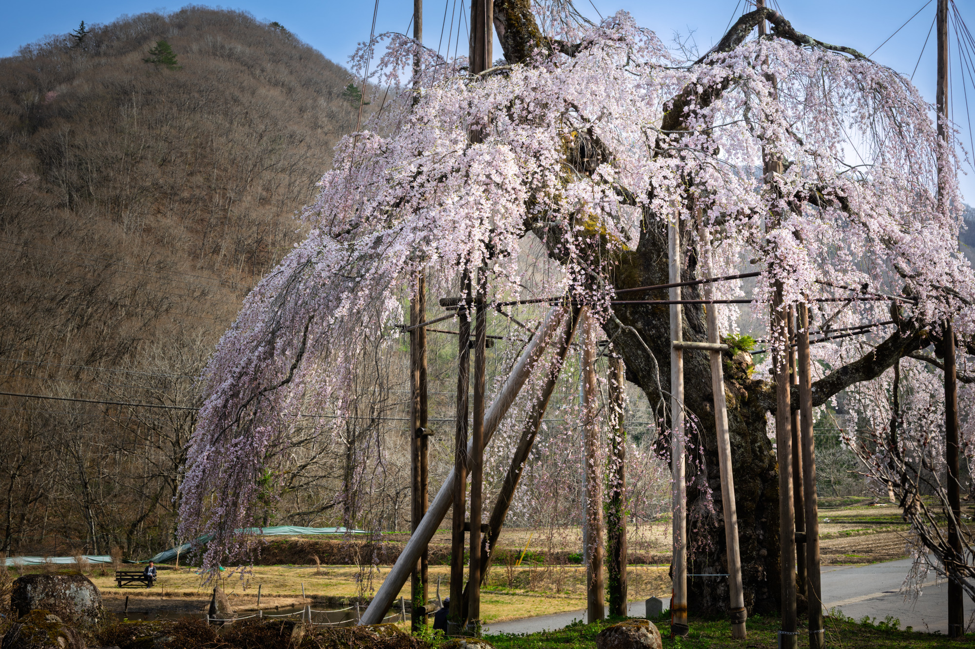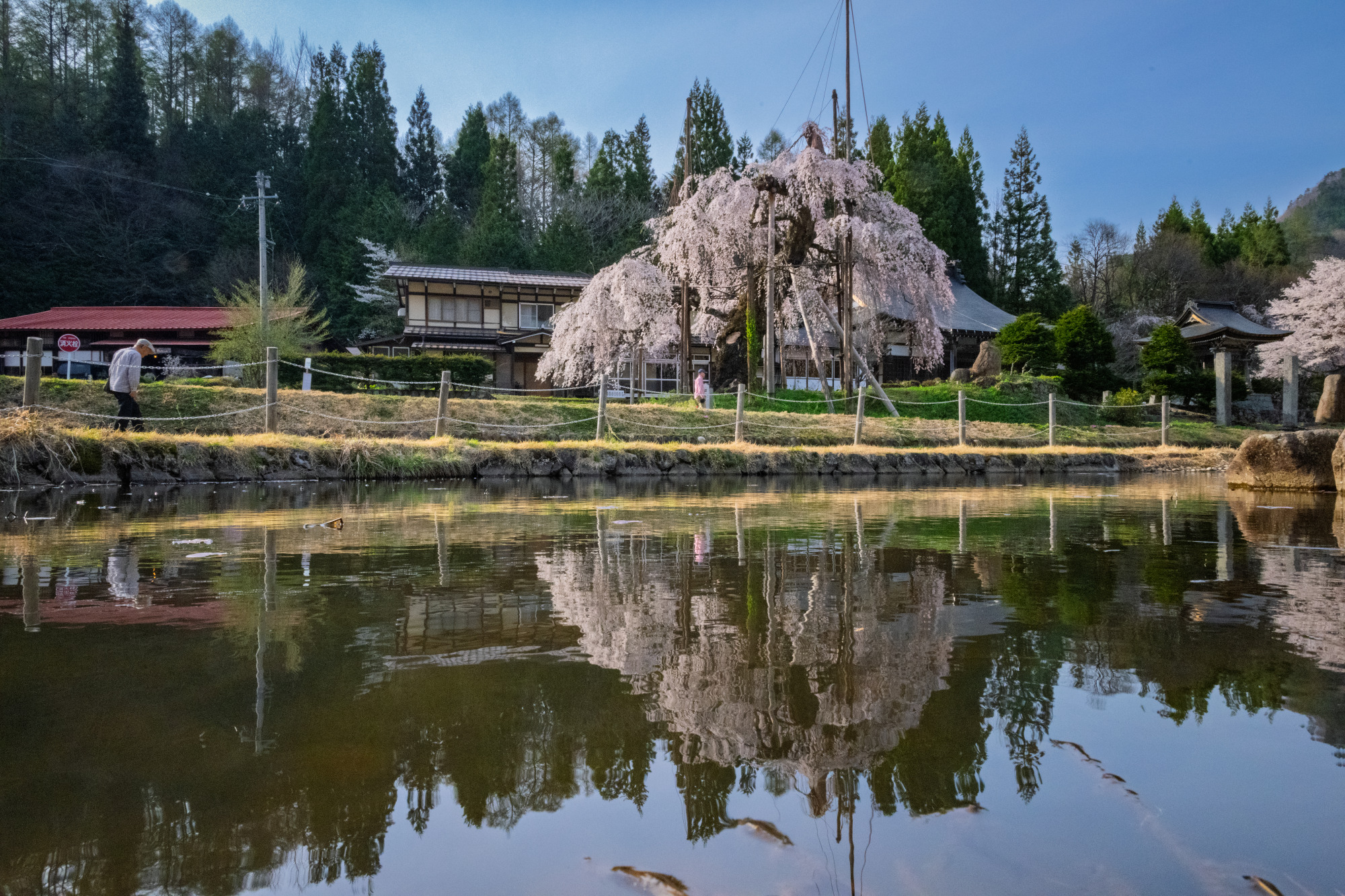 例年、桜の開花に合わせてライトアップを行っており、地面に届きそうなほど大きく垂れ下がる重たげな枝が闇夜に浮かび上がります。静謐な水田に鏡のように映る枝垂れ桜の姿は、まるで別世界につながるかのような幻想的な雰囲気。息を吞むほど美しい景色は必見です。