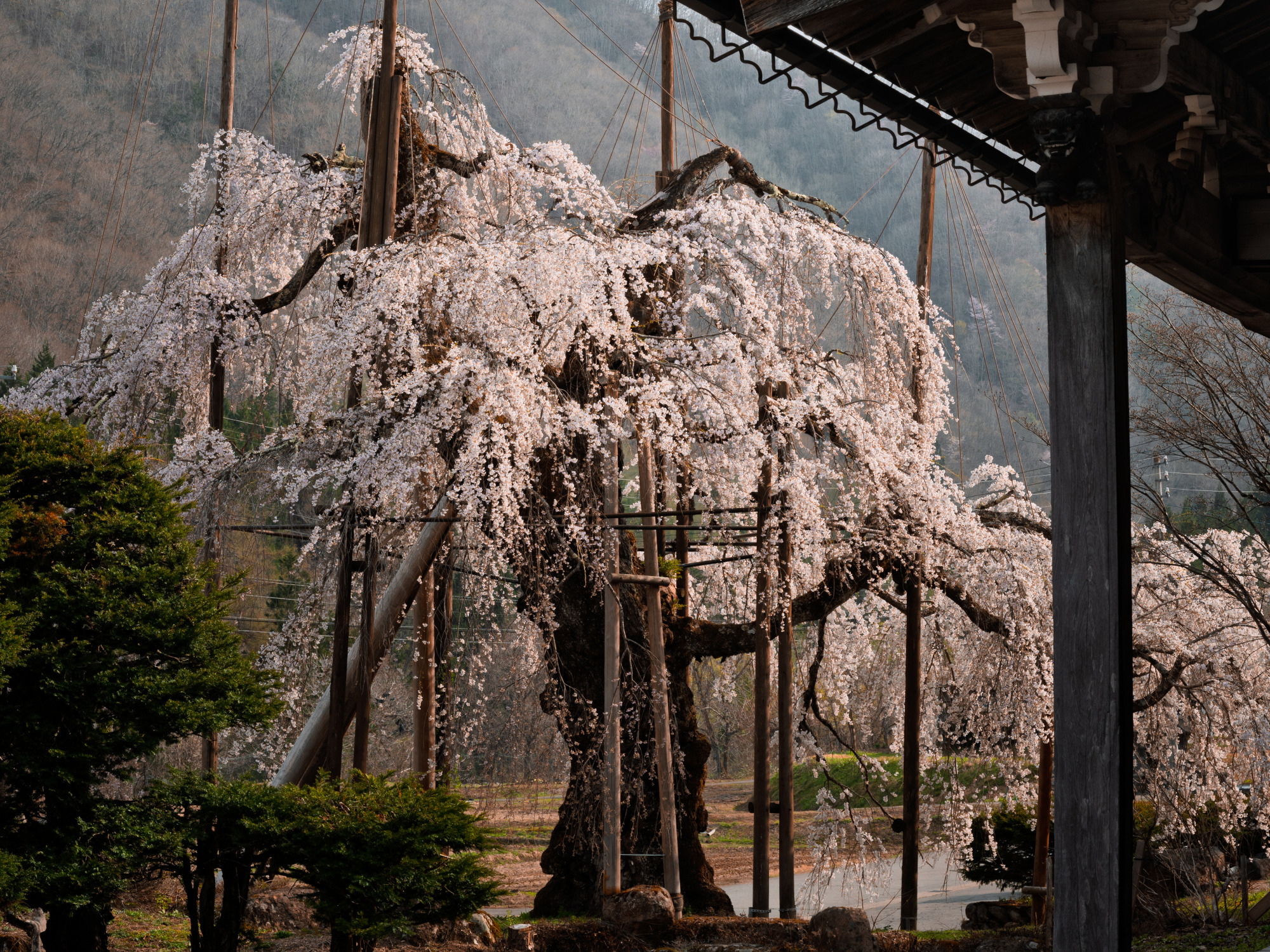 「青屋神明神社」の枝垂れ桜は「枝垂れ桜の郷 飛騨あさひ」を代表する名木です。神社の前には水を湛えた田が広がり、映り込んだ逆さ桜は他では見られない美しさ。自然が作り出す美と神社の神秘的な雰囲気が調和したその姿は、心を打つ感動的な景色。