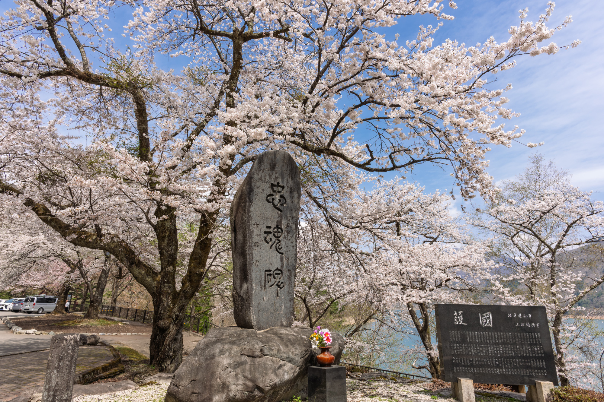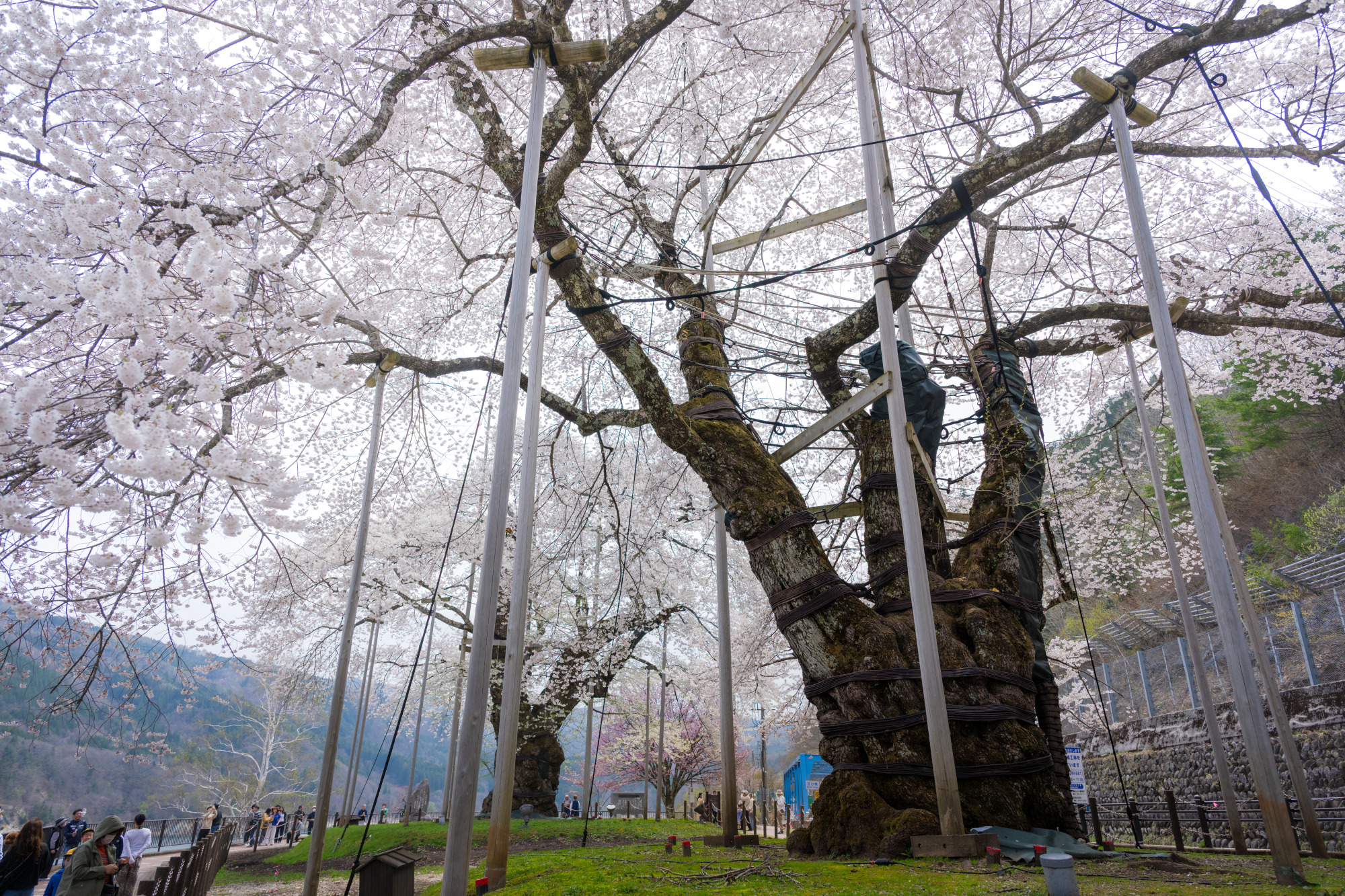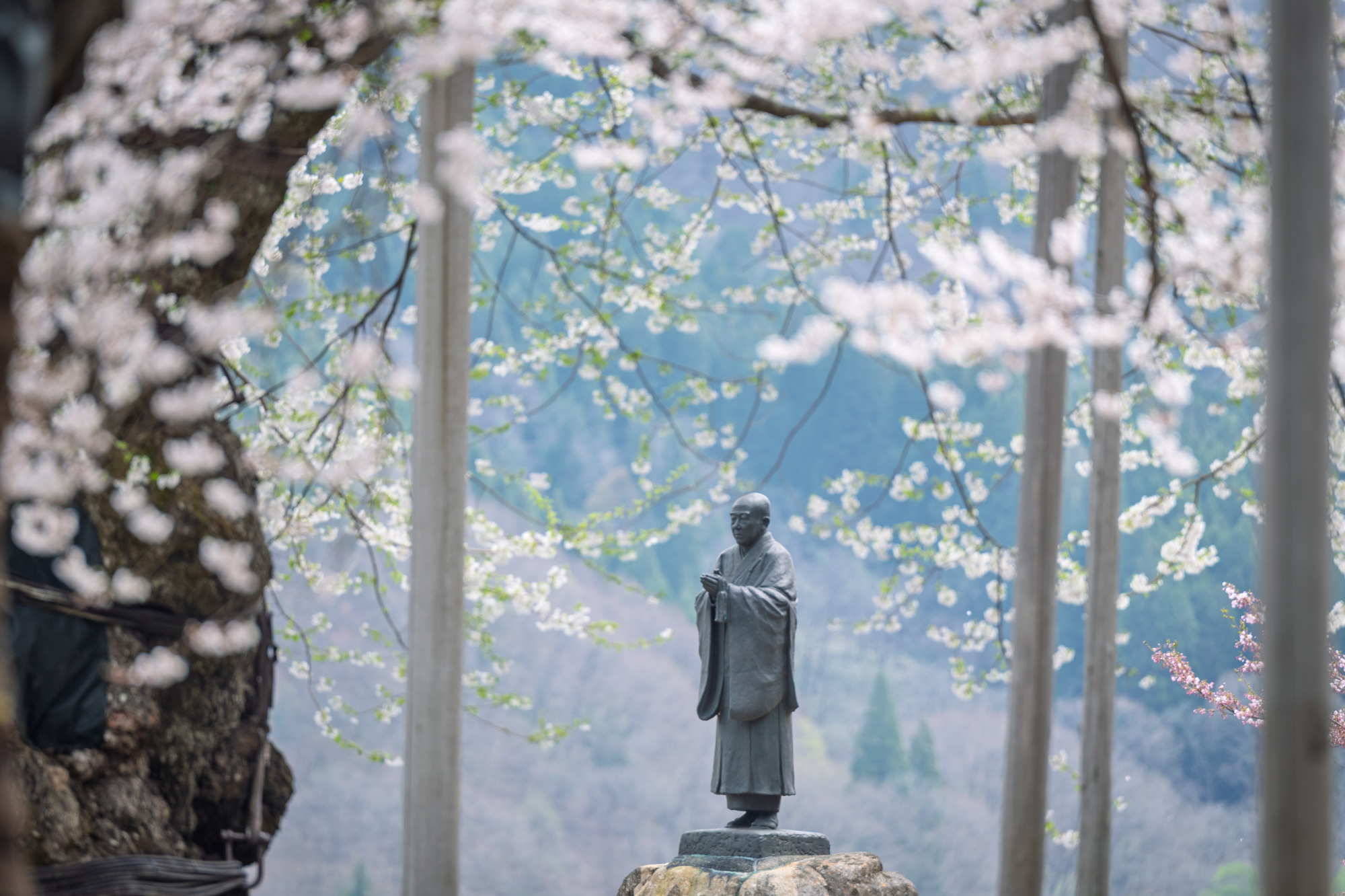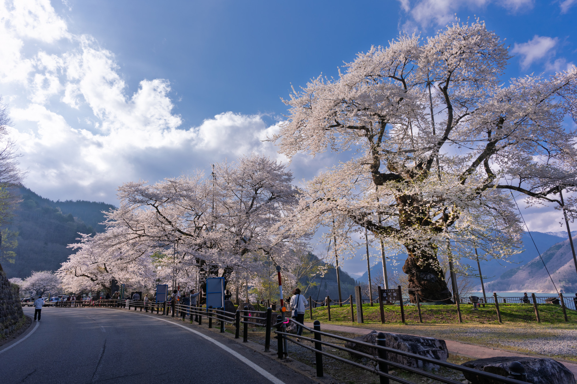 樹齢500年以上、樹高約20m、幹周約6mの老桜「荘川桜」。御母衣ダムの湖畔にただずむ、岐阜県指定天然記念物です。優雅な姿で年月を重ねた風格を感じさせ、大きく一面に広がる桜の花は、まるで時を超えて語りかけるかのよう。荘川桜は、御母衣ダムの建設により湖底に沈む運命にありましたが、桜を愛する人々の手により、移植など不可能だと言われる中、世界史上例を見ない大移植事業を経てこの地に移されたものです。命を救われた桜は、そんな人々の心に応えるかのように、今もこの地から水没したふるさとを見守っています。