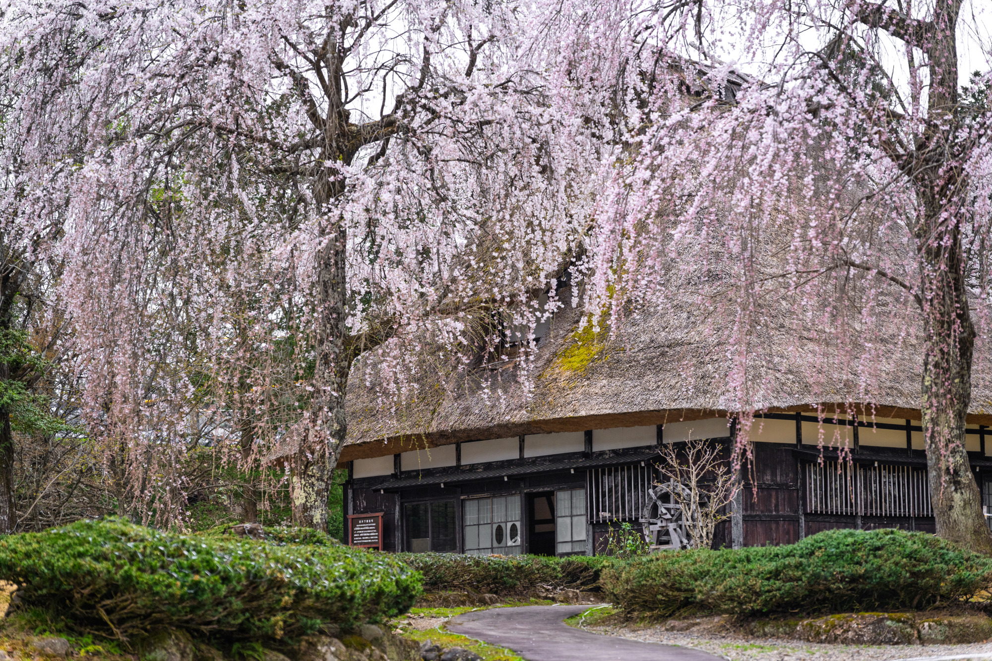 荘川村の伝統家屋「寄棟式入母屋合掌造り」など、古くから荘川に伝わる家屋が移築保存されている「飛騨荘川の里」。当時の暮らしや風土を見ることができます。合掌造りなど古き良き日本の風情が感じられ、まるで時間が止まったかのような雰囲気。桜の花が咲き誇る中、昔ばなしに出てくるような風景が一層幻想的な雰囲気を醸し出します。荘川の里はペットOKなので、愛犬との散策にもオススメです。