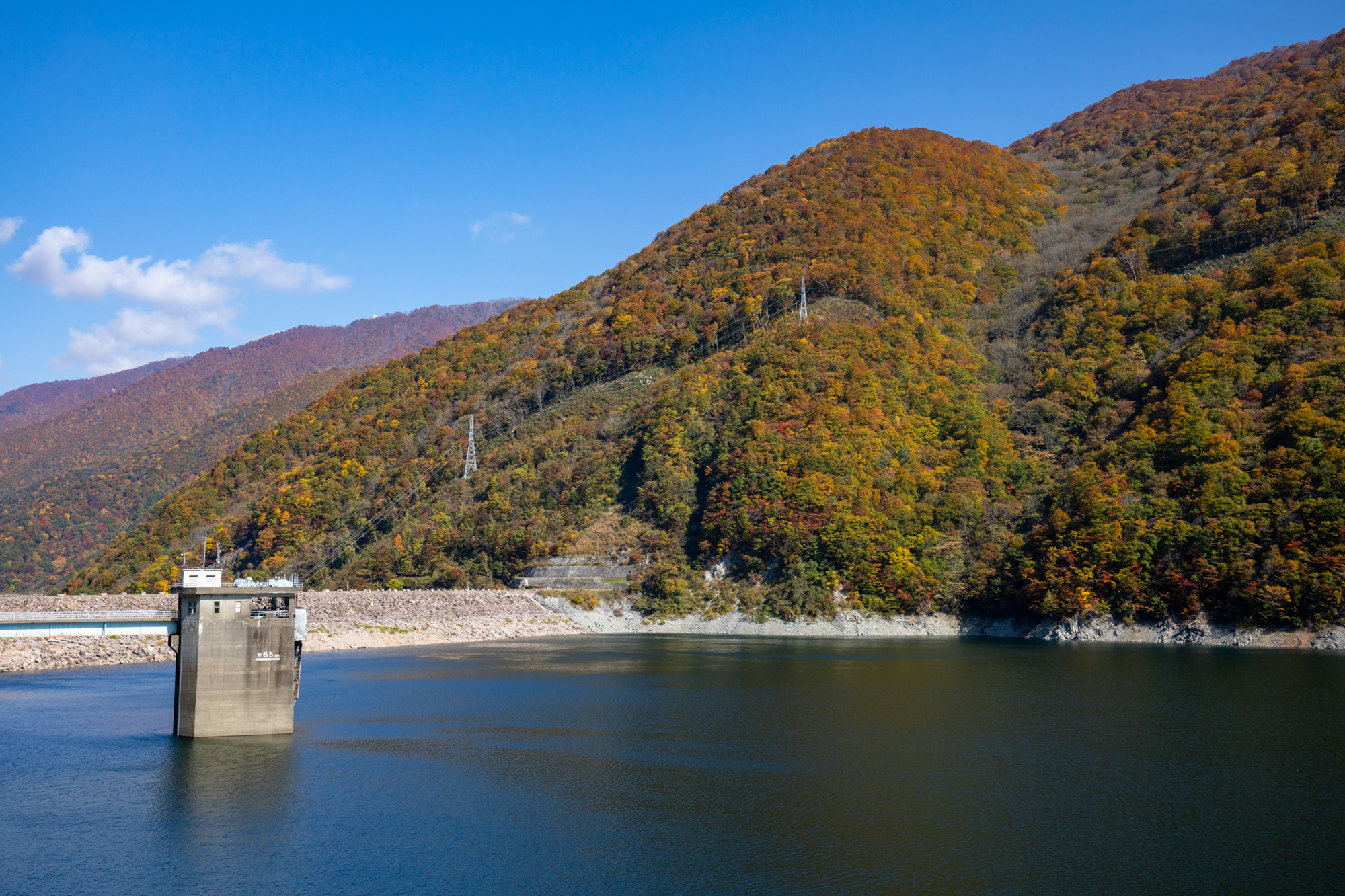 【ひだ荘川】エメラルドグリーンの湖面と紅葉のコントラストが美しい穴場の紅葉スポット「御母衣(みぼろ)ダム」