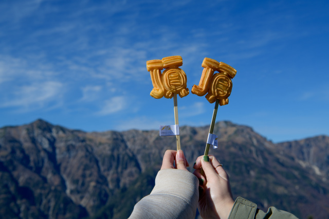 - 頂チュロスを北アルプスを背景に撮影!青空と美しい山々に頂の文字が映えます♡