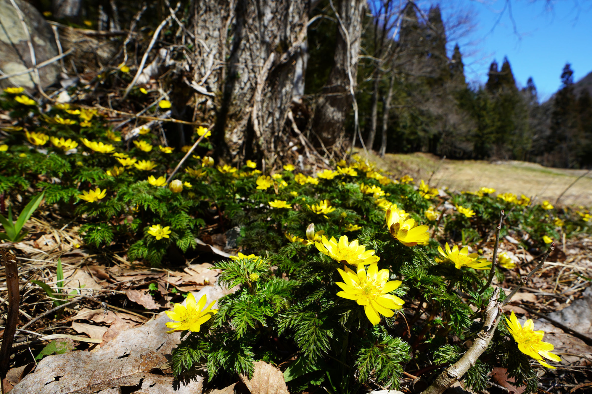 やまびこ街道沿いには、ミズバショウやフクジュソウの群生、寺の境内に佇む枝垂れ桜など、春を告げる花々が静かに咲き始めます。
