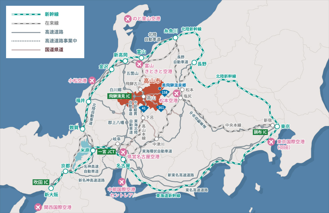 高山市は岐阜県の北部に位置します。高速道路で各地と繋がっており、アクセスはスムーズです。お車でお越しいただく他、JRや高速バスを利用するのが一般的です。