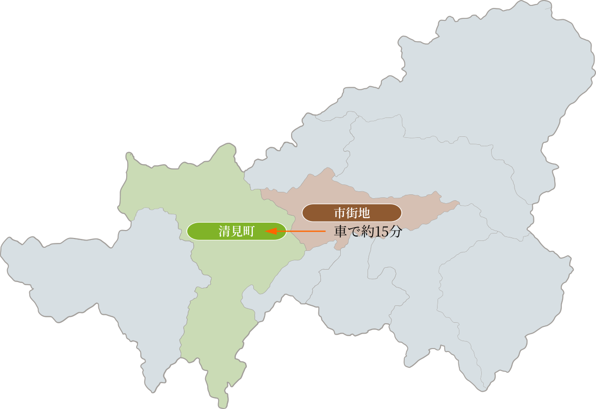 高山市街地よりひだ清見までは、お車で15分ほどです。路線バスもありますが、主要な観光スポットまで公共交通機関のみで往復するのは難しく、レンタカーやタクシーと組み合わせて利用されるのが良いでしょう。