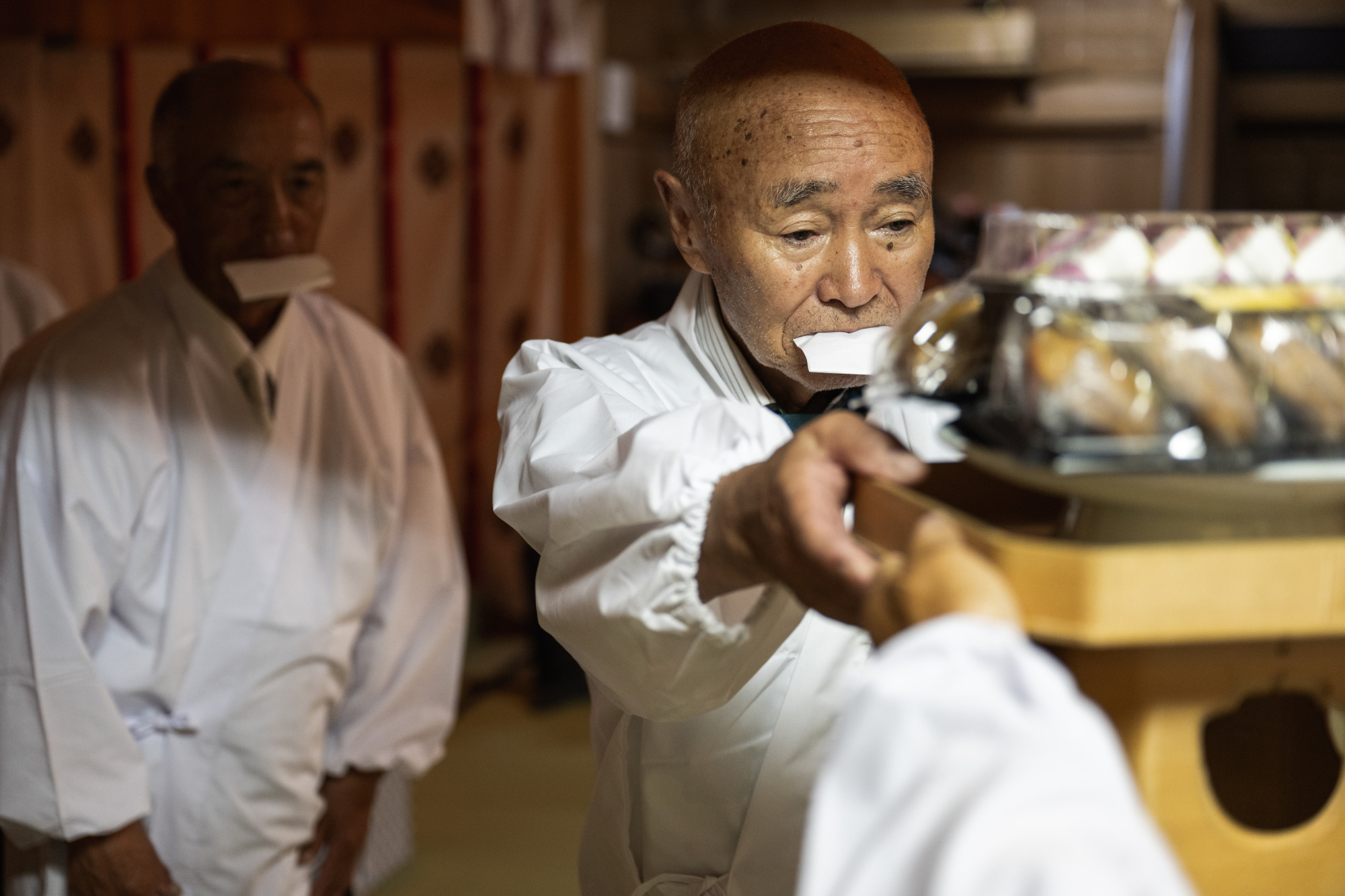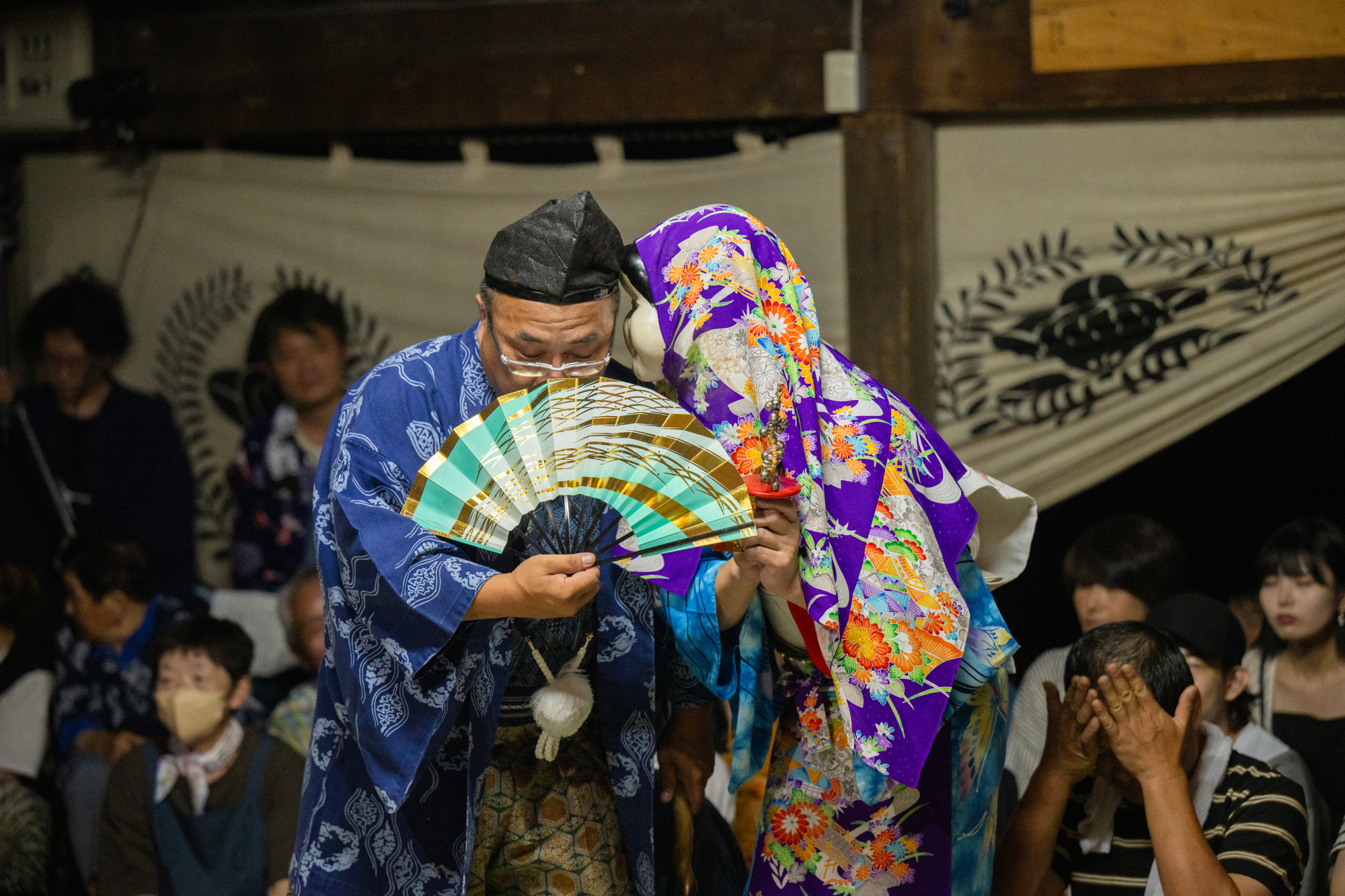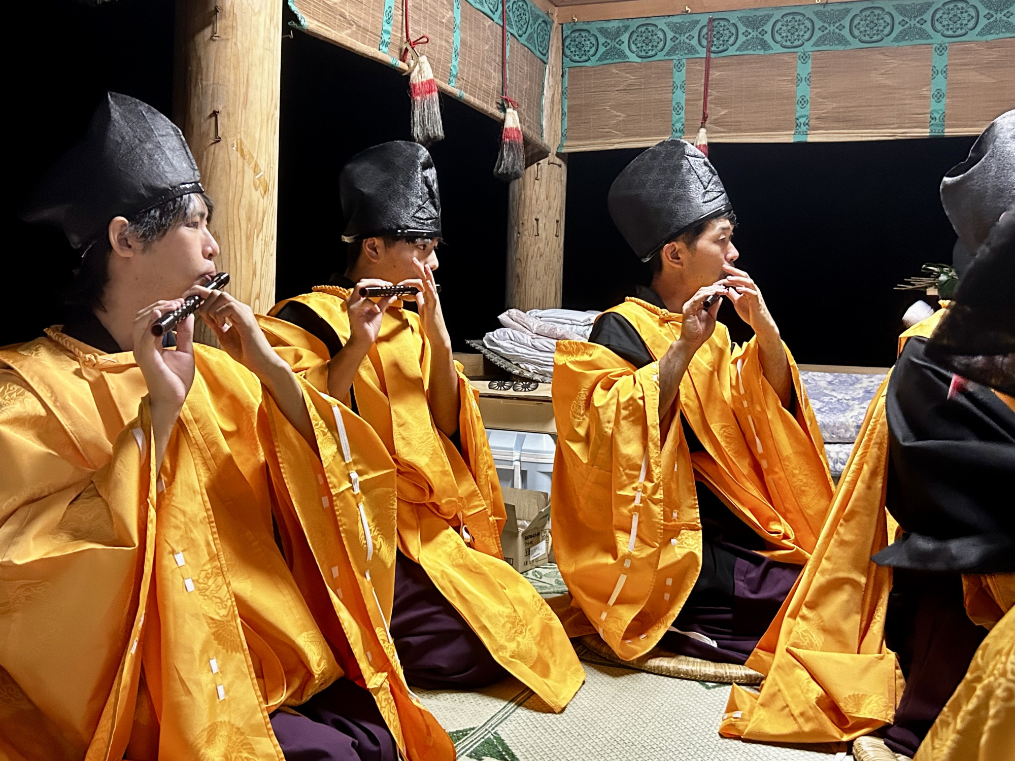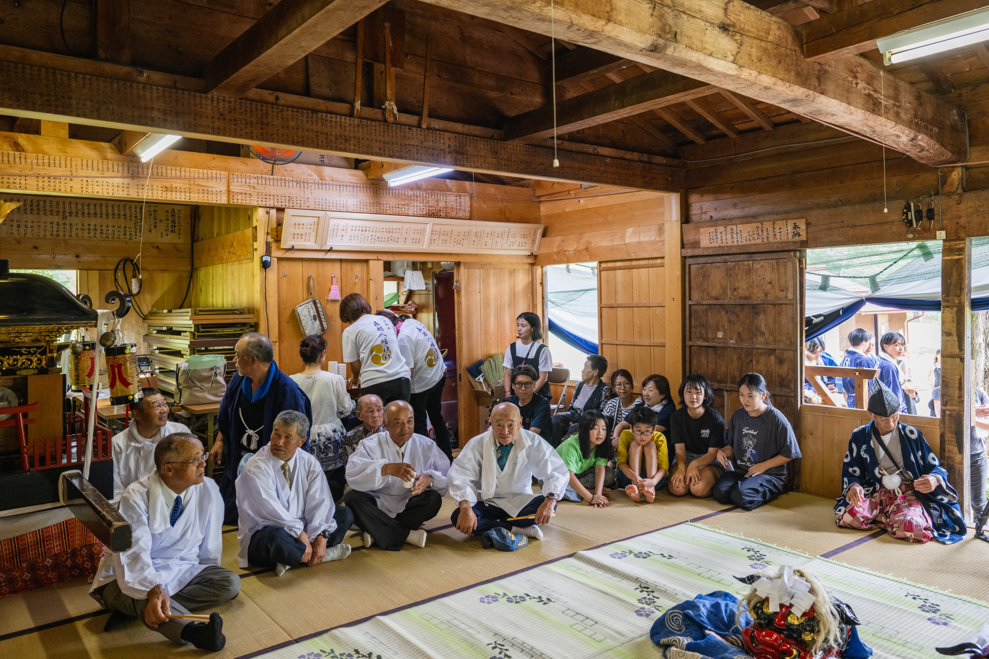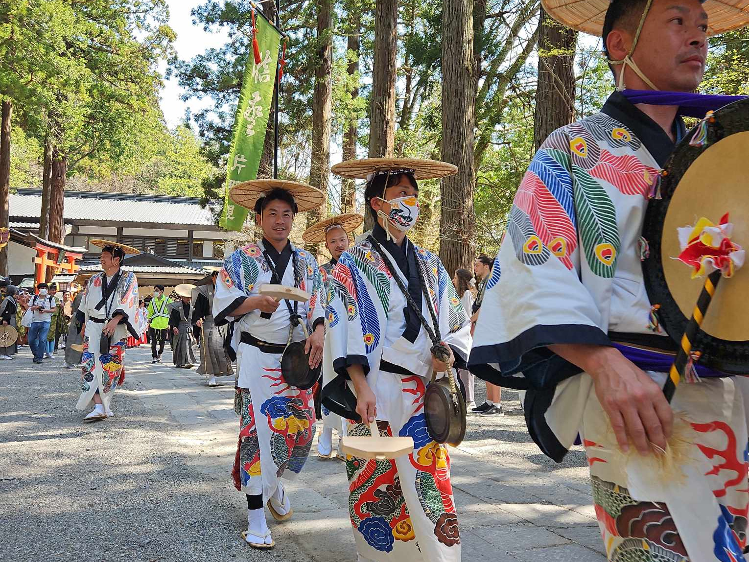 | 2日目 村祭り:氏子青年(若連中)で構成される獅子神楽が午前中町内の事業所などを訪ね、獅子神楽を披露する 参向:年宿(公民館)を11時に出立する 神事:神社本殿で神事を行うとともに浦安の舞、獅子神楽、闘鶏楽の奉納を行う 神輿行列:神様を神輿に遷御し、その年該当の御旅所に向けて神輿行列を開始する(約100名) 御旅所:御旅所に到着次第、神様を御旅所神殿に遷御し、神事を行った後、浦安の舞、獅子神楽、闘鶏楽の奉納を行う 還幸:御旅所で休憩後、本殿に向かって還幸、赤鬼・青鬼・おかめ・ひょっとこに紛した氏子青年が、神輿行列の警護に参加 神事:本殿に神輿を入れ、神還し、神事を行う 全体直会:年宿に移動し、終了の挨拶と全体の直会を行い、終了 | |