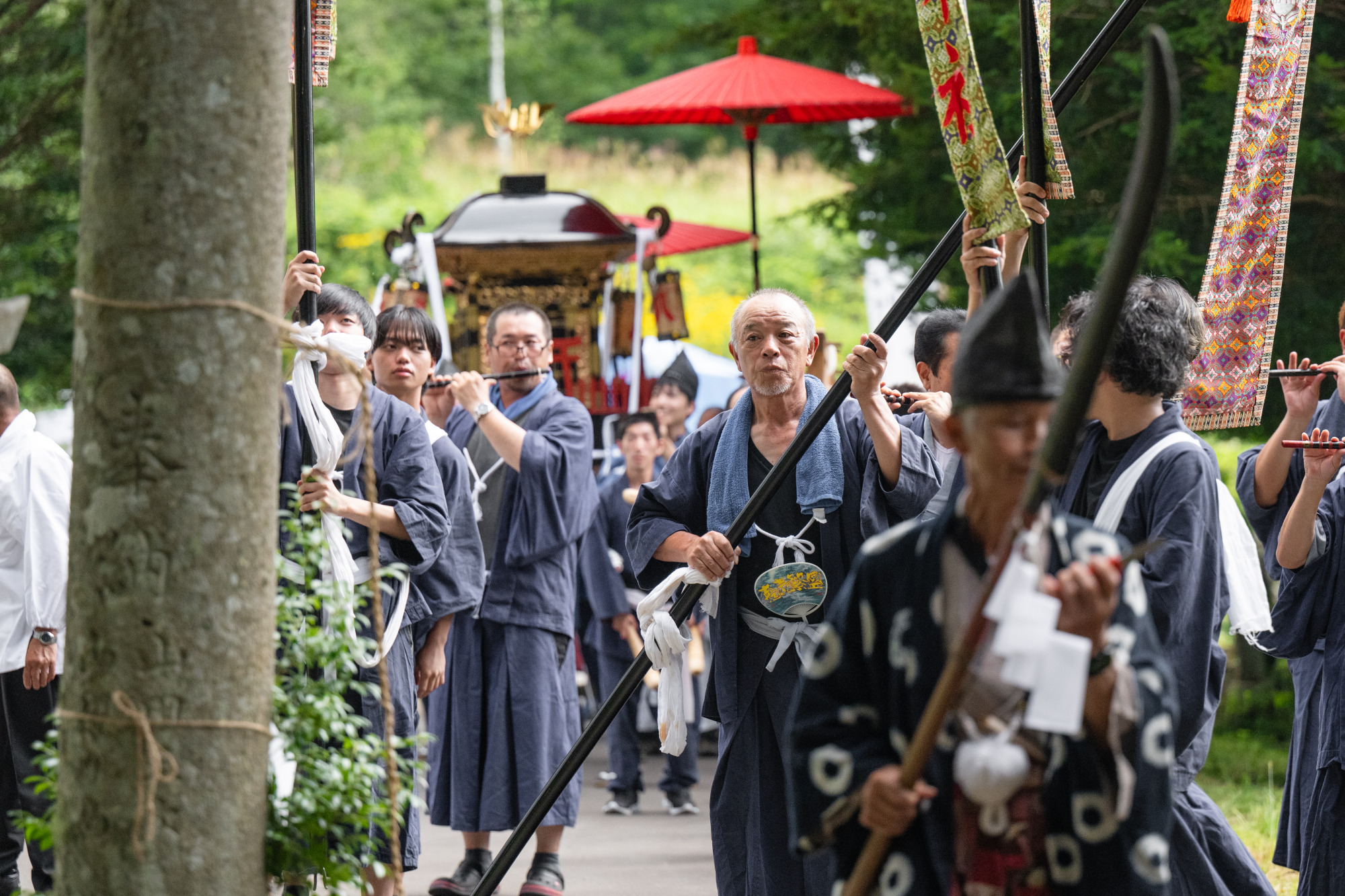 | 例祭の見どころ | 1日目 旗立て、旗下やわい 氏子を大きく3地区に区分し、各地区が神輿行列を迎えるための幟旗や御旅所の準備を行う |